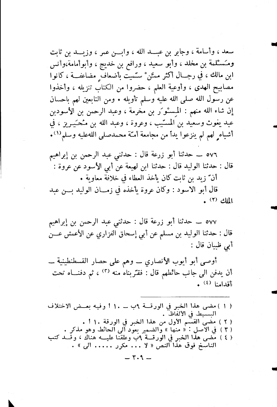 حدثنا أبو زرعة قَالَ: حَدَّثَنِي عَبْدُ الرَّحْمَنِ بْنُ إِبْرَاهِيمَ قال: حَدَّثَنَا الْوَلِيدُ بْنُ مُسْلِمٍ عَنْ أَبِي إِسْحَاقَ الْفَزَارِيِّ عَنِ الْأَعْمَشِ عَنْ أَبِي ظُبْيَانَ قَالَ: أَوْصَى أَبُو أَيُّوبَ الْأَنْصَارِيُّ - وَهُمْ عَلَى حِصَارِ الْقُسْطَنْطِينِيَّةِ - أَنْ يُدْفَنَ إِلَى جَانِبِ حَائِطِهِمْ قَالَ: فَقَرَّبْنَاهُ مِنْهُ، ثُمَّ دَفَنَّاهُ تَحْتَ أقدامنا.