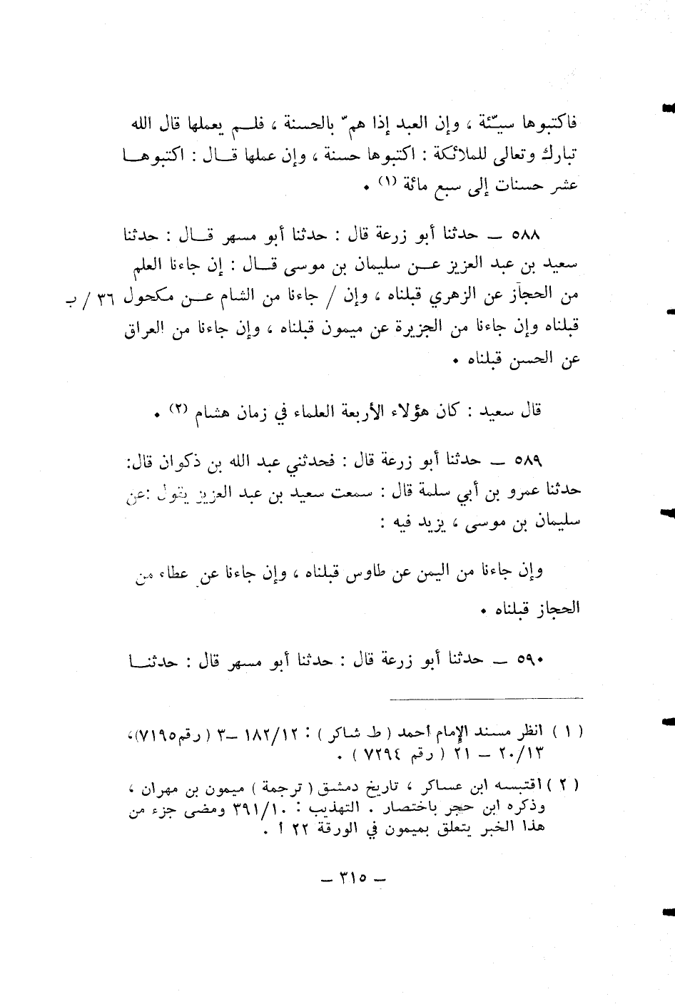 حدثنا أبو زرعة قَالَ: حَدَّثَنَا أَبُو مُسْهِرٍ قَالَ: حَدَّثَنَا سَعِيدُ بْنُ عَبْدِ الْعَزِيزِ عَنْ سُلَيْمَانَ بْنِ مُوسَى قَالَ: إِنْ جَاءَنَا الْعِلْمُ مِنَ الْحِجَازِ عَنِ الزُّهْرِيِّ قَبِلْنَاهُ، وَإِنْ جَاءَنَا مِنَ الشَّامِ عَنْ مَكْحُولٍ قَبِلْنَاهُ، وَإِنْ جَاءَنَا مِنَ الْجِزِيرَةِ عَنْ مَيْمُونٍ قَبِلْنَاهُ، وَإِنْ جَاءَنَا مِنَ الْعِرَاقِ عَنِ الْحَسَنِ قَبِلْنَاهُ.
