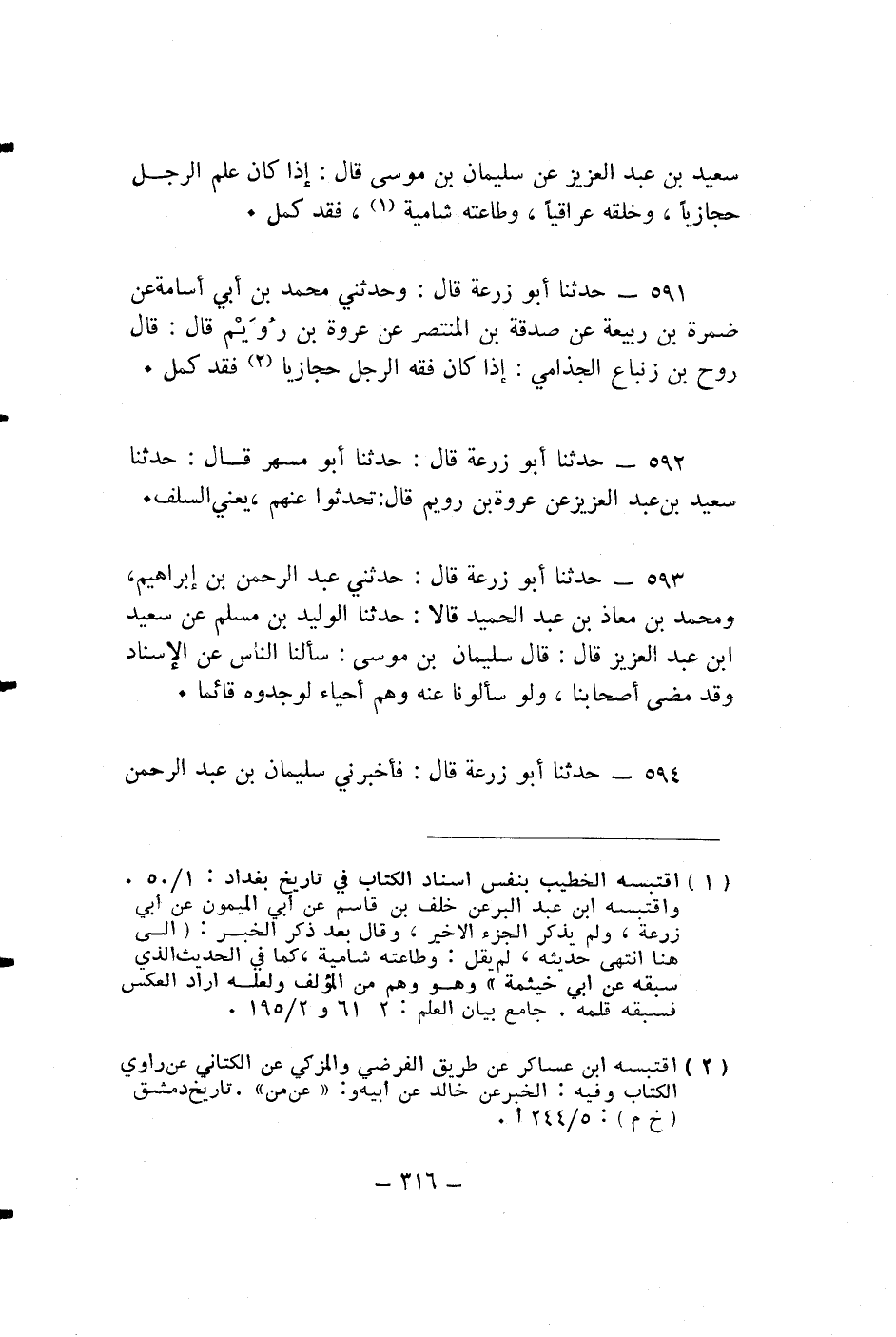 حدثنا أبو زرعة قَالَ: حَدَّثَنِي عَبْدُ الرَّحْمَنِ بْنُ إبراهيم، ومحمد بن معاذ عَبْدِ الْحَمِيدِ قَالَا: حدثنا الْوَلِيدُ بْنِ مَسْلِمٍ عَنْ سَعِيدِ بْنِ عَبْدِ الْعَزِيزِ قال: قَالَ سُلَيْمَانُ مُوسَى: سَأَلْنَا النَّاسَ عَنِ الْإِسْنَادِ وَقَدْ مَضَى أَصْحَابُنَا، وَلَوْ سَأَلُونَا عنه وهم أحياء لوجد قائماً.