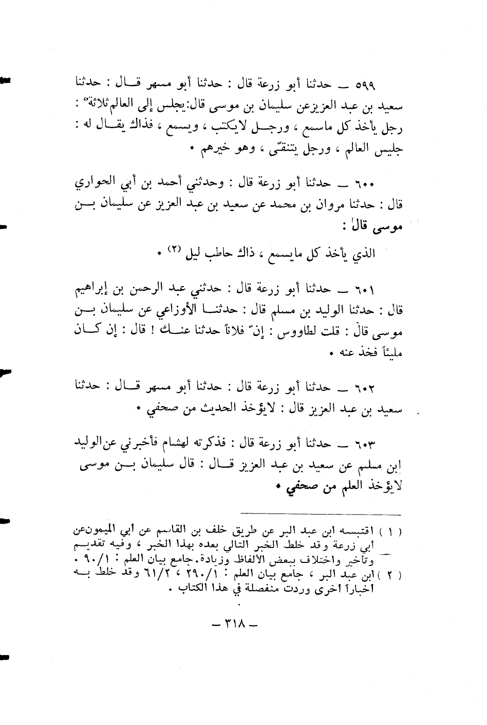 حدثنا أبو زرعة قَالَ: فَذَكَرْتُهُ لِهِشَامٍ فَأَخْبَرَنِي عَنِ الْوَلِيدِ بْنِ مَسْلِمٍ عَنْ سَعِيدِ بْنُ عَبْدِ الْعَزِيزِ قَالَ: قَالَ سُلَيْمَانُ بْنُ مُوسَى لَا يُؤْخَذُ العلم من صحفي.