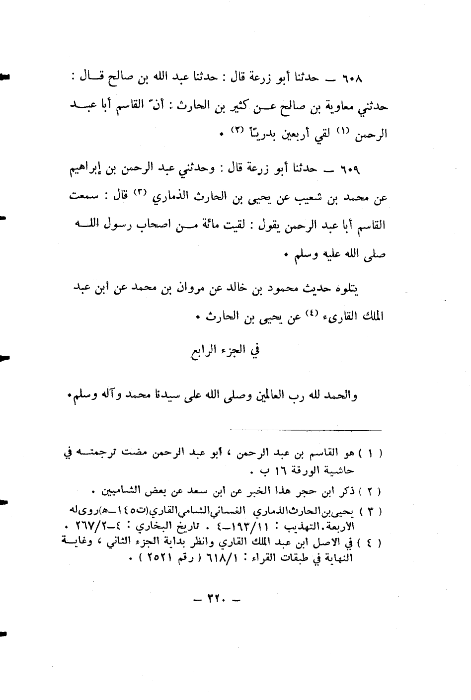حدثنا أبو زرعة قال: وَحَدَّثَنِي عَبْدُ الرَّحْمَنِ بْنُ إِبْرَاهِيمَ عَنْ مُحَمَّدِ بْنِ شُعَيْبٍ عَنْ يَحْيَى بْنِ الْحَارِثِ الذِّمَّارِيِّ قال: سَمِعْتُ الْقَاسِمَ أَبَا عَبْدِ الرَّحْمَنِ يَقُولُ: لَقِيتُ مِائَةً مِنْ أَصْحَابِ رَسُولِ اللَّهِ صَلَّى اللَّهُ عليه وسلم.