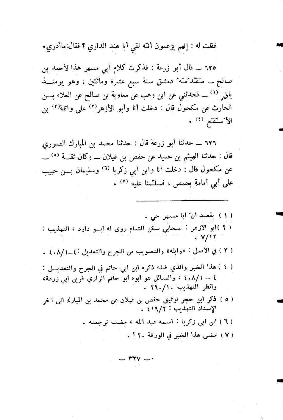 قال أبو زرعة: فَذَكَرْتُ كَلَامَ أَبِي مُسْهِرٍ هَذَا لِأَحْمَدَ بْنِ صَالِحٍ - مَقْدَمَهُ دِمَشْقَ سَنَةَ سَبْعَ عَشْرَةَ وَمِائَتَيْنِ، وَهُوَ يَوْمَئِذٍ بَاقٍ - فَحَدَّثَنِي عَنِ ابْنِ وَهْبٍ عَنْ مُعَاوِيَةَ بْنِ صَالِحٍ عَنِ الْعَلَاءِ بْنِ الْحَارِثِ عَنْ مَكْحُولٍ قَالَ: دَخَلْتُ أَنَا وَأَبُو الْأَزْهَرِ عَلَى وَاثِلَةَ بْنِ الْأَسْقَعِ.