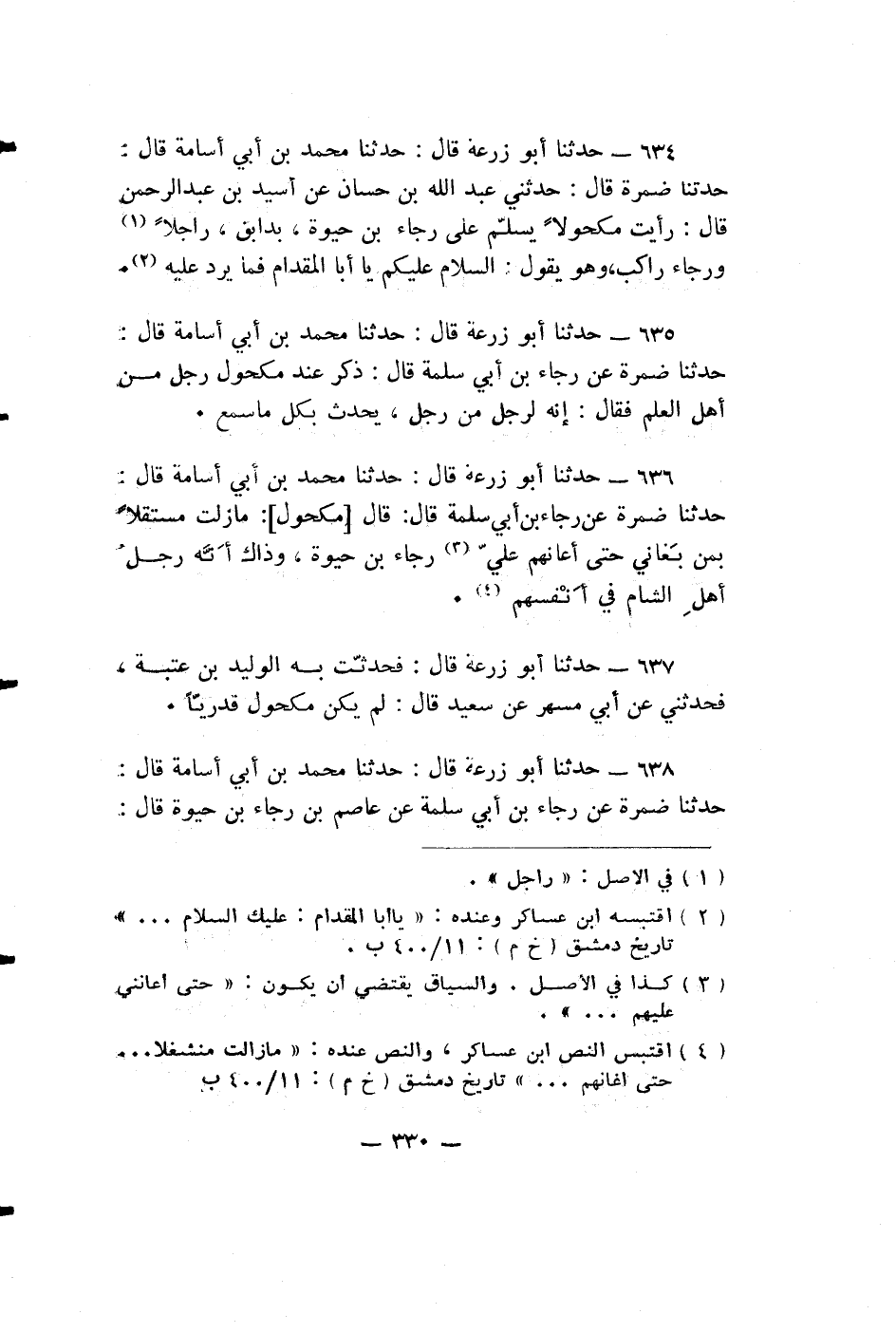 حدثنا أبو زرعة قال: حدثنا مُحَمَّدُ بْنُ أَبِي أُسَامَةَ قال: حَدَّثَنَا ضَمْرَةُ قَالَ: حَدَّثَنِي عَبْدُ اللَّهِ بْنُ حَسَّانَ عَنْ أُسَيْدِ بْنِ عَبْدِ الرَّحْمَنِ قَالَ: رَأَيْتُ مَكْحُولًا يُسَلِّمُ عَلَى رَجَاءِ بْنِ حَيْوَةَ، بِدَابِقَ، رَاجِلًا وَرَجَاءٌ رَاكِبٌ، وَهُوَ يَقُولُ: السَّلَامُ عَلَيْكُمْ يَا أَبَا الْمِقْدَامِ فَمَا يرد عليه.