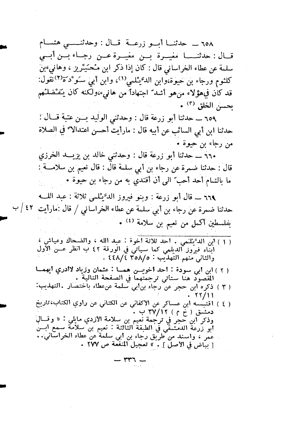 حدثنا أبو زرعة قال: وَحَدَّثَنِي هِشَامُ قال: حَدَّثَنَا مُغِيرَةُ بْنُ مُغِيرَةَ عَنْ رَجَاءَ بْنِ أَبِي سَلَمَةَ عَنْ عَطَاءٍ الْخُرَاسَانِيِّ قَالَ: كَانَ إِذَا ذُكِرَ ابن محيريز، وهانىء بْنُ كُلْثُومٍ وَرَجَاءُ بْنُ حَيْوَةَ، وَابْنُ الدَّيْلَمِيِّ، وَابْنُ أَبِي سَوْدَةَ نَقُولُ: قَدْ كَانَ فِي هَؤُلَاءِ من هو أشد اجتهاداً من هانىء، وَلَكِنَّهُ كَانَ يَفْضُلُهُمْ بِحُسْنِ الْخُلُقِ.