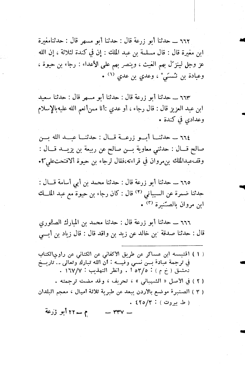 حدثنا أبو زرعة قال: حدثنا مُحَمَّدُ بْنُ أَبِي أُسَامَةَ قال: حَدَّثَنَا ضَمْرَةُ عَنِ السَّيْبَانِيِّ قَالَ: كَانَ رَجَاءُ بْنُ حَيْوَةَ مَعَ عَبْدِ الْمَلِكِ بْنِ مروان بالصنبرة.
