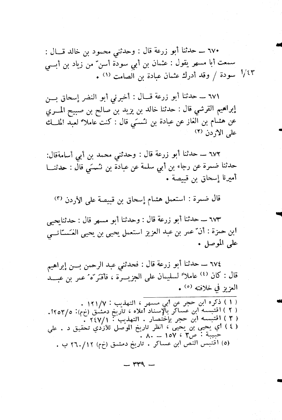 حدثنا أبو زرعة قَالَ: أَخْبَرَنِي أَبُو النَّضْرِ إِسْحَاقُ بْنُ إِبْرَاهِيمَ الْقُرَشِيُّ قال: حَدَّثَنَا خَالِدِ بْنِ يَزِيدَ بْنِ صَالِحِ بْنِ صُبَيْحٍ الْمُرِّيُّ عَنْ هِشَامِ بْنِ الْغَازِ عَنْ عُبَادَةَ بْنِ نُسَيٍّ قَالَ: كُنْتُ عَامِلًا لِعَبْدِ الملك على الأردن.