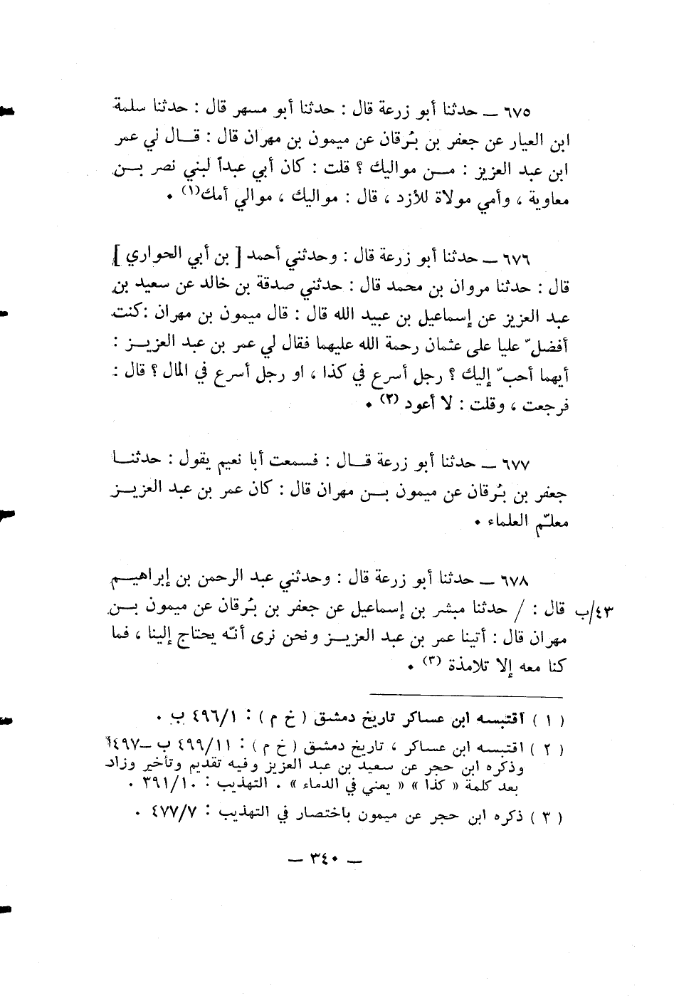 حدثنا أبو زرعة قال: وَحَدَّثَنِي عَبْدُ الرَّحْمَنِ بْنُ إِبْرَاهِيمَ قال: حَدَّثَنَا مُبَشِّرُ بْنُ إِسْمَاعِيلَ عَنْ جَعْفَرِ بْنِ بُرْقَانَ عَنْ مَيْمُونِ بْنِ مِهْرَانَ قال: أَتَيْنَا عُمَرَ بْنَ عَبْدِ الْعَزِيزِ وَنَحْنُ نَرَى أَنَّهُ يَحْتَاجُ إِلَيْنَا، فَمَا كَنَّا مَعَهُ إِلَّا تَلَامِذَةً.