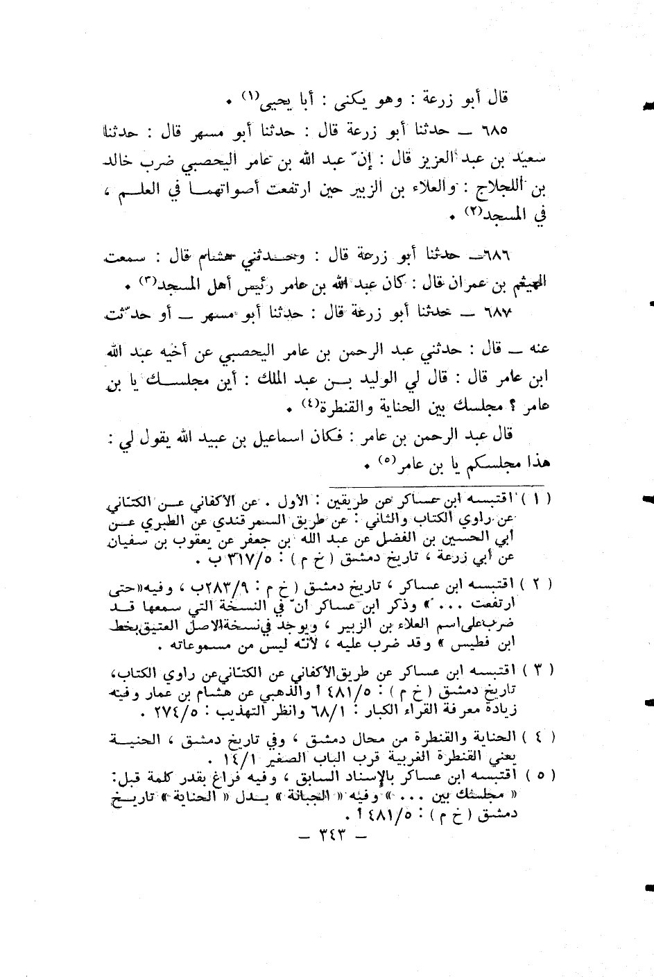 حدثنا أبو زرعة قَالَ: حَدَّثَنَا أَبُو مُسْهِرٍ قَالَ: حَدَّثَنَا سَعِيدُ بْنُ عَبْدِ الْعَزِيزِ قَالَ: إِنَّ عَبْدَ اللَّهِ بْنَ عَامِرٍ الْيَحْصُبِيَّ ضَرَبَ خَالِدَ بْنَ اللَّجْلَاجِ: وَالْعَلَاءَ بْنَ الزُّبَيْرِ حِينَ ارتفعت أصواتهما في العلم، في المسجد.
