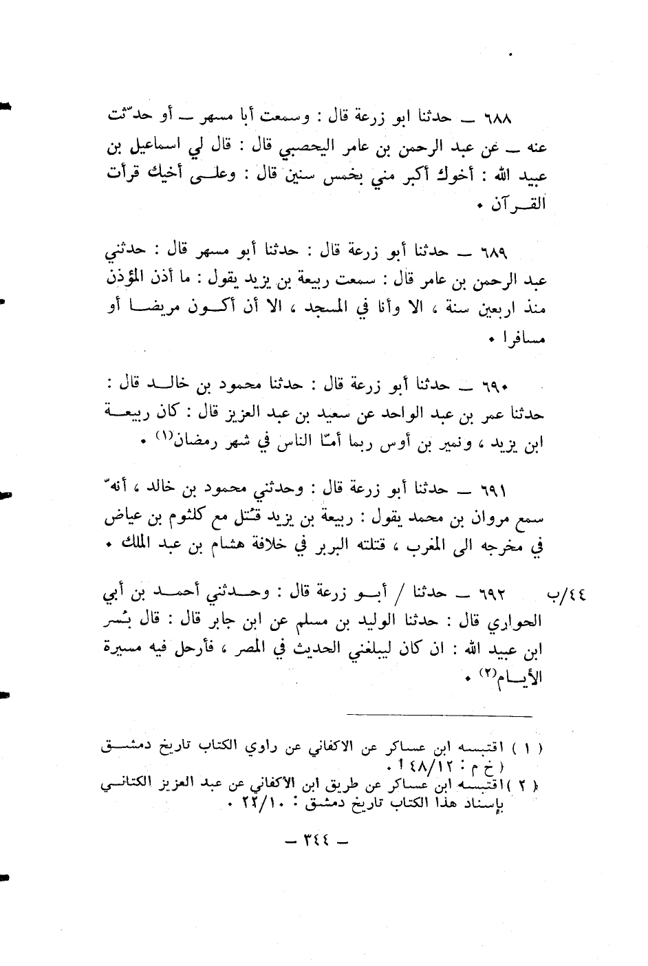 حدثنا أبو زرعة قَالَ: حَدَّثَنَا أَبُو مُسْهِرٍ قَالَ: حَدَّثَنِي عَبْدُ الرَّحْمَنِ بْنُ عَامِرٍ قَالَ: سَمِعْتُ رَبِيعَةَ بْنَ يَزِيدَ يَقُولُ: مَا أَذَّنَ الْمُؤَذِّنُ مُنْذُ أَرْبَعِينَ سَنَةً، إِلَّا وَأَنَا فِي الْمَسْجِدِ، إِلَّا أَنْ أَكُونَ مَرِيضًا أو مسافراً.