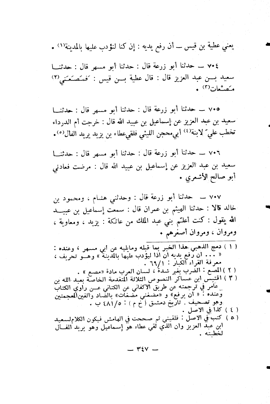 حدثنا أبو زرعة قَالَ: حَدَّثَنَا أَبُو مُسْهِرٍ قَالَ: حَدَّثَنَا سَعِيدُ بْنُ عَبْدِ الْعَزِيزِ عَنْ إِسْمَاعِيلَ بْنِ عَبْدِ اللَّهِ قَالَ: مَرِضْتُ فَعَادَنِي أَبُو صَالِحٍ الأشعري.