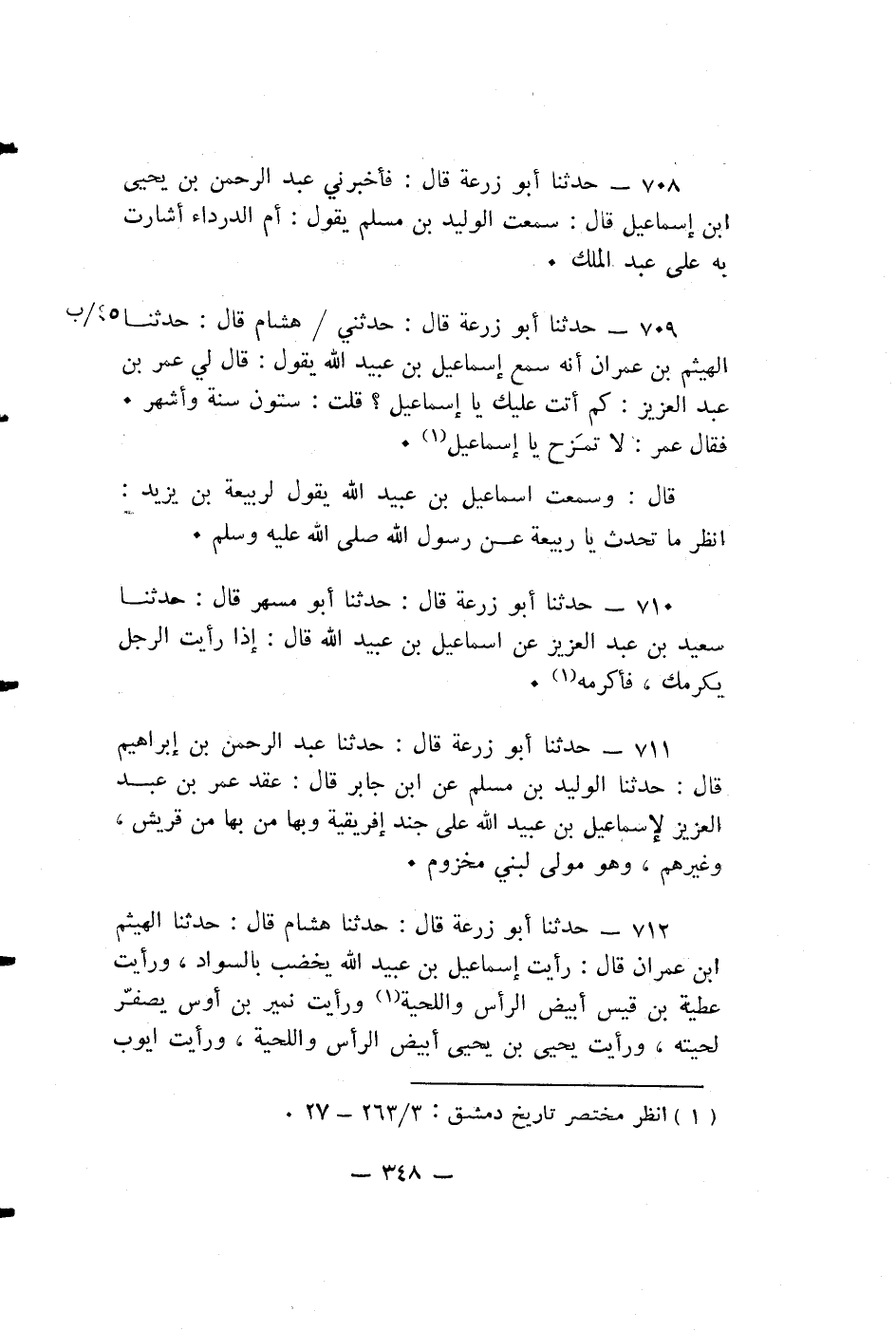 حدثنا أبو زرعة قال: فَأَخْبَرَنِي عَبْدُ الرَّحْمَنِ بْنُ يَحْيَى بْنِ إِسْمَاعِيلَ قال: سَمِعْتُ الْوَلِيدَ بْنَ مُسْلِمٍ يَقُولُ: أُمُّ الدَّرْدَاءِ أَشَارَتْ بِهِ عَلَى عَبْدِ الملك.