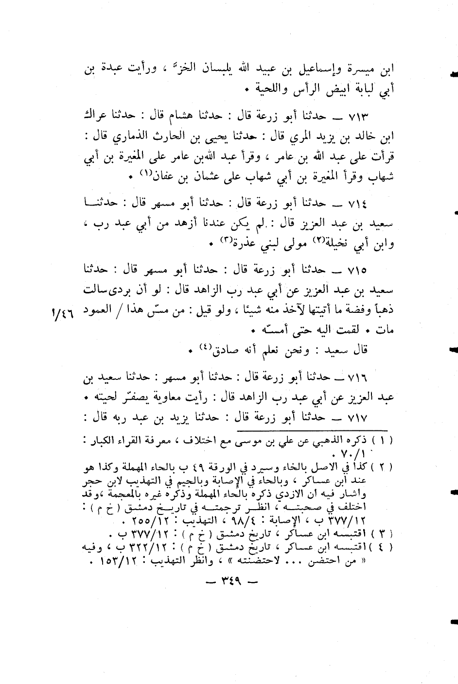 حدثنا أبو زرعة قَالَ: حدثنا هِشَامٌ قال: حَدَّثَنَا عِرَاكُ بْنُ خَالِدِ بْنِ يَزِيدَ الْمُرِّيُّ قال: حَدَّثَنَا يَحْيَى بْنُ الْحَارِثِ الذِّمَّارِيُّ قَالَ: قَرَأْتُ عَلَى عَبْدِ اللَّهِ بْنِ عَامِرٍ، وَقَرَأَ عَبْدُ اللَّهِ بْنُ عَامِرٍ عَلَى الْمُغِيرَةِ بْنِ أَبِي شِهَابٍ وَقَرَأَ الْمُغِيرَةُ بْنُ أَبِي شِهَابٍ عَلَى عثمان بن عفان.