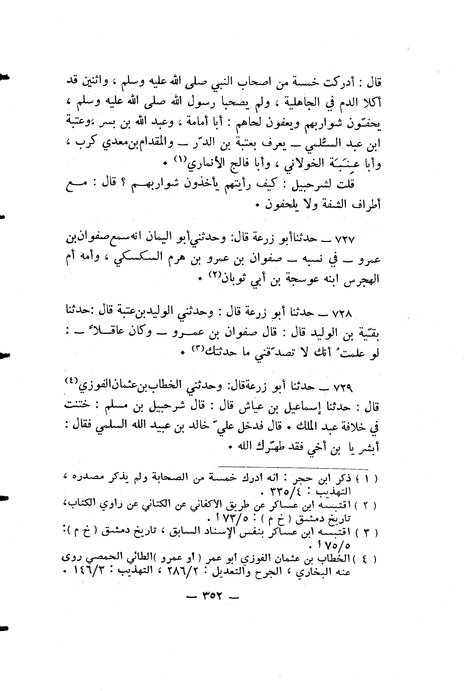 أَدْرَكْتُ خَمْسَةً مِنْ أَصْحَابِ النَّبِيِّ صَلَّى اللَّهُ عَلَيْهِ وسَلَّمَ، وَاثْنَيْنِ قَدْ أَكَلَا الدَّمَ فِي الْجَاهِلِيَّةِ، وَلَمْ يَصْحَبَا رَسُولَ اللَّهِ صَلَّى اللَّهُ عَلَيْهِ وَسَلَّمَ، يَحِفُّونَ شَوَارِبَهُمْ وَيُعْفُونَ لِحَاهُمْ: أَبَا أُمَامَةَ، وَعَبْدَ اللَّهِ بْنَ بُسْرٍ، وَعُتْبَةَ بْنَ عَبْدٍ السُّلَمِيَّ - يُعْرَفُ بِعُتْبَةَ بْنِ الدُّرِ - وَالْمِقْدَامَ بْنَ مَعْدِي كَرِبَ، وَأَبَا عِنَبَةَ الْخَوْلَانِيَّ، وَأَبَا فالج الأنصاري.