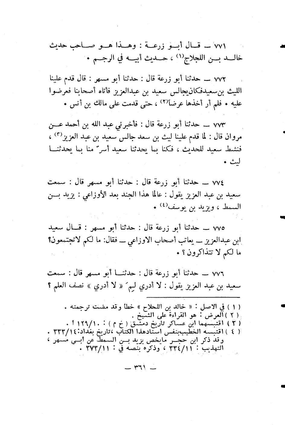 حدثنا أبو زرعة قال: فأخبرني عَبْدُ اللَّهِ بْنُ أَحْمَدَ عَنْ مَرْوَانَ قَالَ: لَمَّا قَدِمَ عَلَيْنَا لَيْثُ بْنُ سَعْدٍ جَالَسَ سَعِيدَ بْنَ عَبْدِ الْعَزِيزِ، فَنَشَطَ سَعِيدٌ لِلْحَدِيثِ، فَكُنَّا بِمَا يُحَدِّثُنَا سَعِيدٌ أَسَرَّ مِنَّا بِمَا يُحَدِّثُنَا لَيْثٌ.