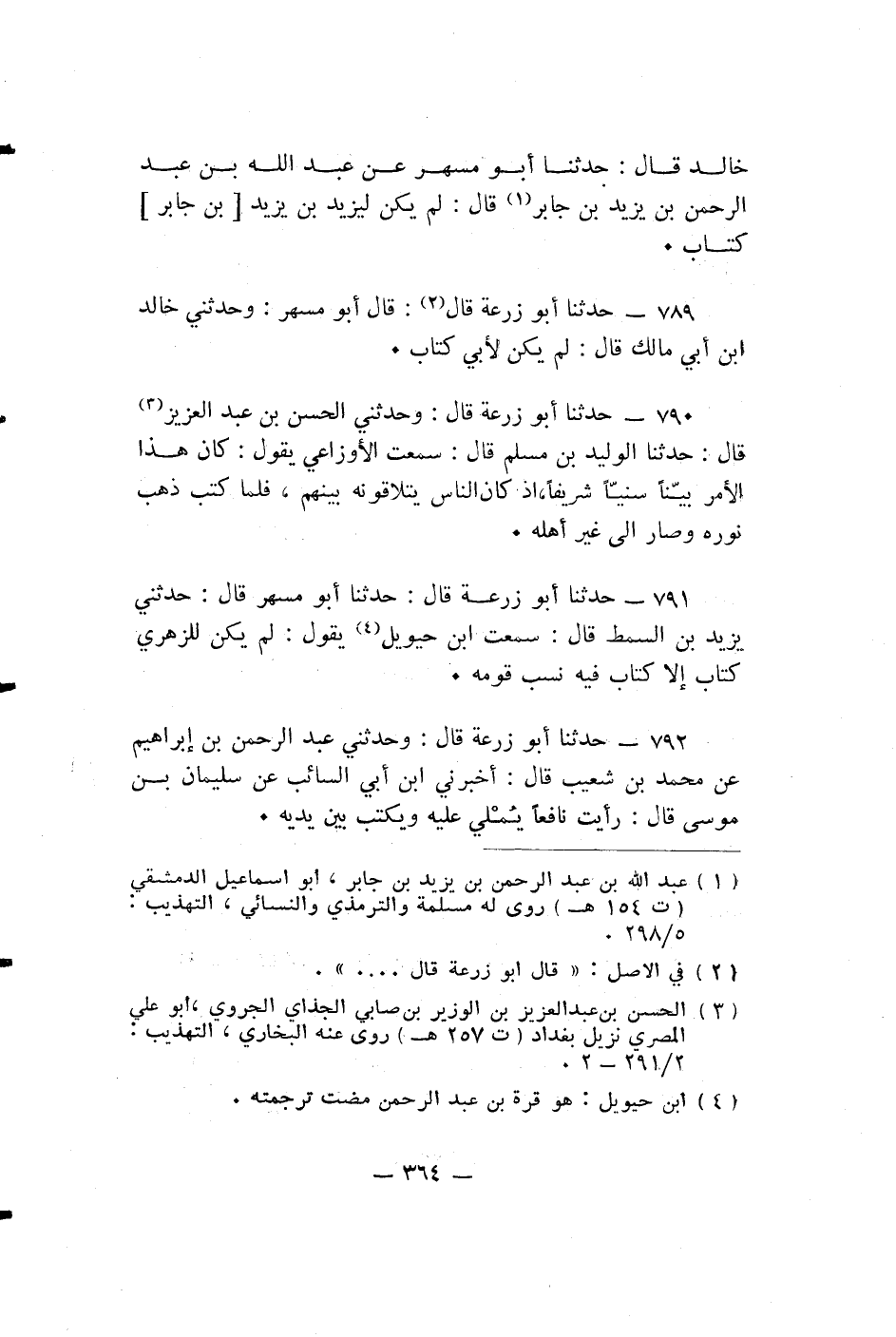 حدثنا أبو زرعة قَالَ: حَدَّثَنَا أَبُو مُسْهِرٍ قَالَ: حَدَّثَنِي يَزِيدُ بْنُ السِّمْطِ قَالَ: سَمِعْتُ ابْنَ حَيْوَيْلَ يَقُولُ: لَمْ يَكُنْ لِلزُّهْرِيِّ كِتَابٌ إِلَّا كِتَابٌ فيه نسب قومه.