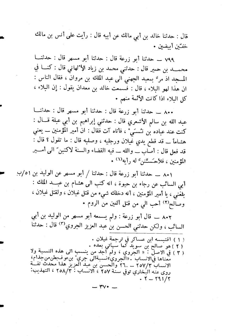 حدثنا أبو زرعة قال: حدثنا أَبُو مُسْهِرٍ عَنْ الْوَلِيدِ بْنِ أَبِي السَّائِبِ عَنْ رَجَاءَ بْنِ حَيْوَةَ، أَنَّهُ كَتَبَ إِلَى هِشَامِ بْنِ عَبْدِ الْمَلِكِ: بَلَغَنِي، يَا أَمِيرَ الْمُؤْمِنِينَ، أَنَّهُ دَخَلَكَ شَيْءٌ مِنْ قَتْلِ غَيْلَانَ، وَلَقَتْلُ غَيْلَانَ، وَصالِحٍ أَحَبُّ إِلَيَّ مِنْ قَتْلِ أَلْفَينِ مِنَ الرُّومِ.