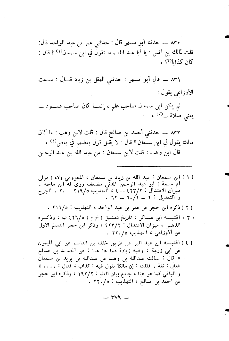 حَدَّثَنِي أَحْمَدُ بْنُ صَالِحٍ قَالَ: قُلْتُ لِابْنِ وَهْبٍ: مَا كَانَ مَالِكٌ يَقُولُ فِي ابْنِ سَمْعَانَ؟ قَالَ: لَا يُقْبَلُ قَوْلُ بَعْضِهِمْ فِي بَعْضٍ.