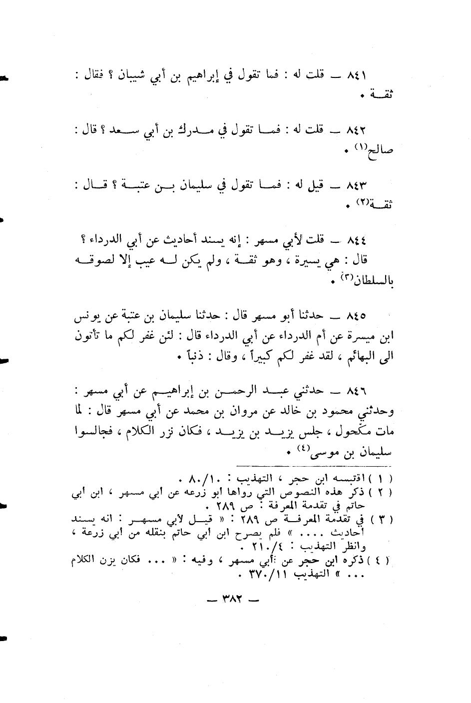 حَدَّثَنِي عَبْدُ الرَّحْمَنِ بْنُ إِبْرَاهِيمَ عَنِ أَبِي مُسْهِرٍ: وَحَدَّثَنِي مَحْمُودُ بْنُ خَالِدٍ عَنْ مَرْوَانَ بْنِ مُحَمَّدٍ عَنْ أَبِي مُسْهِرٍ قَالَ: لَمَّا مَاتَ مَكْحُولٌ، جَلَسَ يَزِيدُ بْنُ يَزِيدَ، فَكَانَ نَزَرَ الْكَلَامَ، فَجَالَسُوا سُلَيْمَانَ بْنَ مُوسَى.