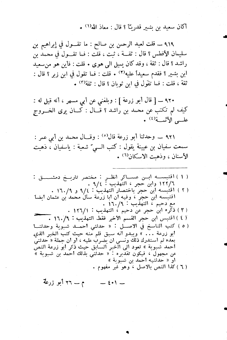 قُلْتُ لِعَبْدِ الرَّحْمَنِ بْنِ صَالِحٍ: مَا تَقُولُ فِي إِبْرَاهِيمَ بْنِ سُلَيْمَانَ الْأَفْطَسِ؟ قال: ثقة، ثبت، قلت: فلما تَقُولُ فِي مُحَمَّدِ بْنِ رَاشِدٍ؟ قَالَ: ثِقَةٌ، وَقَدْ كَانَ يَمِيلُ إِلَى هَوًى. قُلْتُ: فَأَيْنَ هُوَ مِنْ سَعِيدِ بْنِ بَشِيرٍ؟ فَقَدَّمَ سَعِيدًا عَلَيْهِ. قُلْتُ فَمَا تَقُولُ فِي ابْنِ زَبْرٍ؟ قَالَ: ثِقَةٌ، قُلْتُ: فَمَا تَقُولُ فِي ابْنِ ثوبان؟ قال: ثقة.