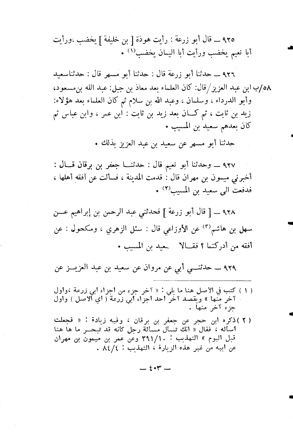 قال أبو زرعة: فَحَدَّثَنِي عَبْدُ الرَّحْمَنِ بْنُ إِبْرَاهِيمَ عَنْ سَهْلِ بْنِ هَاشِمٍ عَنِ الْأَوْزَاعِيِّ قَالَ: سُئِلَ الزُّهْرِيُّ، وَمَكْحُولٌ: عَنْ أَفْقَهِ مَنْ أَدْرَكْتُمَا؟ فَقَالَا سَعِيدُ بْنُ الْمُسَيِّبِ.