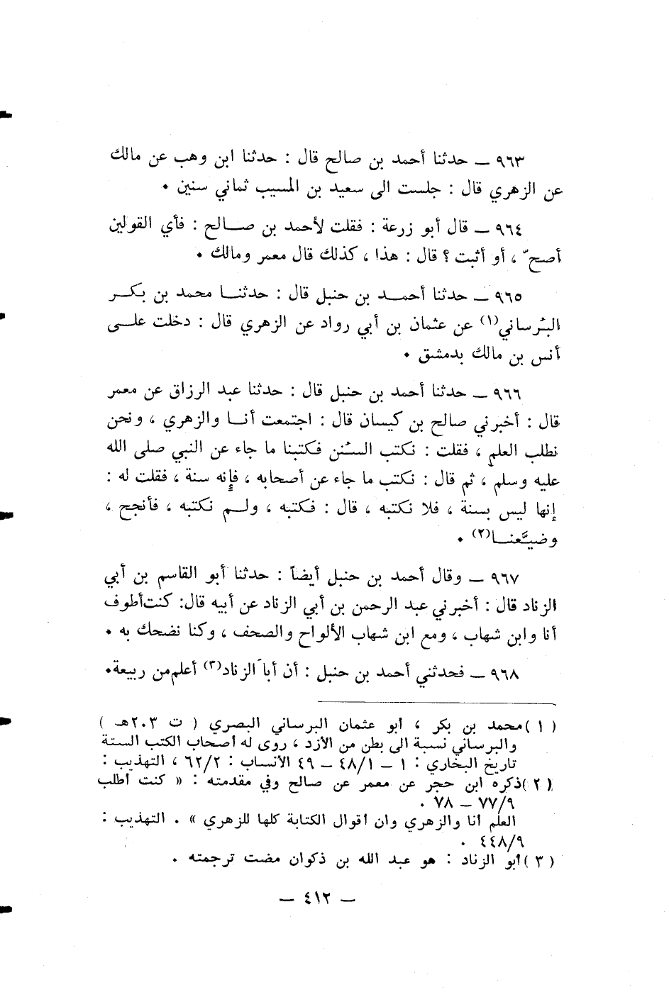 حدثنا أَحْمَدُ بْنُ حَنْبَلٍ قال: حَدَّثَنَا مُحَمَّدُ بْنُ بَكْرٍ الْبُرْسَانِيُّ عَنْ عُثْمَانَ بْنِ أَبِي رَوَّادٍ عَنِ الزُّهْرِيِّ قَالَ: دَخَلْتُ عَلَى أَنَسِ بْنِ مَالِكٍ بِدِمَشْقَ.