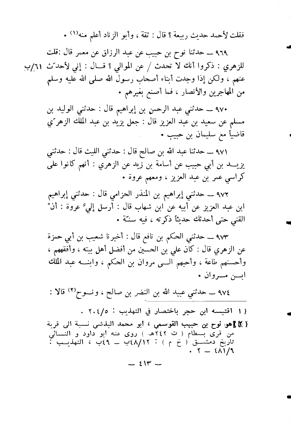 حدثنا نُوحُ بْنُ حَبِيبٍ عَنْ عَبْدِ الرَّزَّاقِ عَنْ مَعْمَرٍ قال: قُلْتُ لِلزُّهْرِيِّ: ذَكَرُوا أَنَّكَ لَا تُحَدِّثُ عَنِ الْمَوَالِي؟ قَالَ: إِنِّي لَأُحَدِّثُ عَنْهُمْ، وَلَكِنْ إِذَا وَجَدْتُ أَبْنَاءَ أَصْحَابِ رَسُولِ اللَّهِ صَلَّى اللَّهُ عَلَيْهِ وسَلَّمَ مِنَ الْمُهَاجِرِينَ وَالْأَنْصَارِ، فَمَا أَصْنَعُ بِغَيْرِهِمْ.
