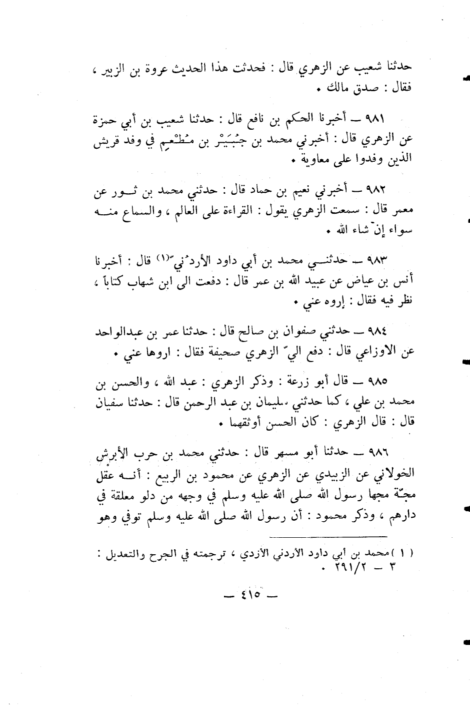 أَخْبَرَنِي نُعَيْمُ بْنُ حَمَّادٍ قَالَ: حَدَّثَنِي مُحَمَّدُ بْنُ ثَوْرٍ عَنْ مَعْمَرٍ قال: سَمِعْتُ الزُّهْرِيَّ يَقُولُ: الْقِرَاءَةُ عَلَى الْعَالِمِ، وَالسَّمَاعُ مِنْهُ سَوَاءٌ إِنْ شَاءَ اللَّهُ.