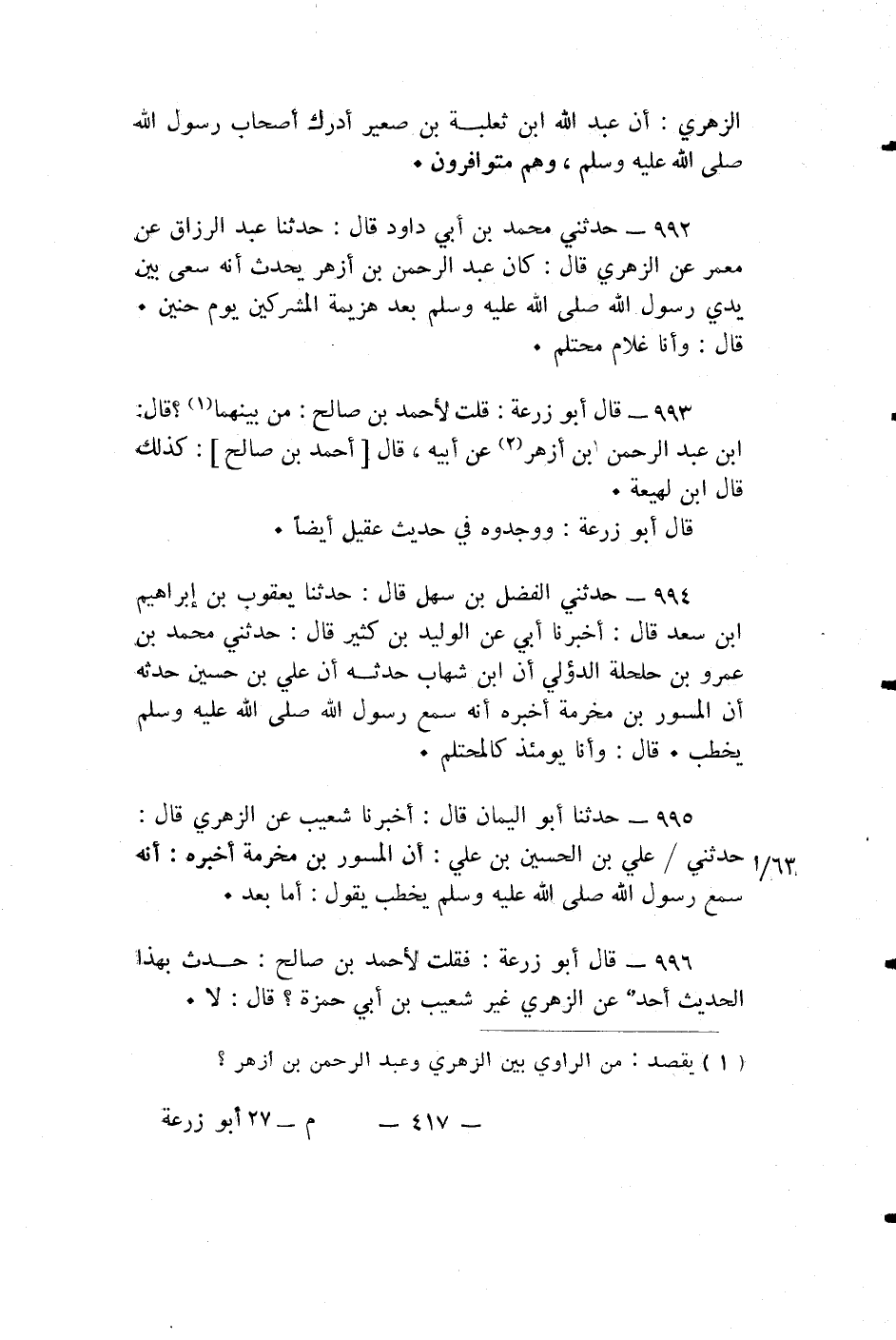 قالا: فَقُلْتُ لِأَحْمَدَ بْنِ صَالِحٍ: حَدَّثَ بِهَذَا الْحَدِيثِ أَحَدٌ عَنِ الزُّهْرِيِّ غَيْرَ شُعَيْبِ بْنِ أَبِي حَمْزَةَ؟ قال: لا.