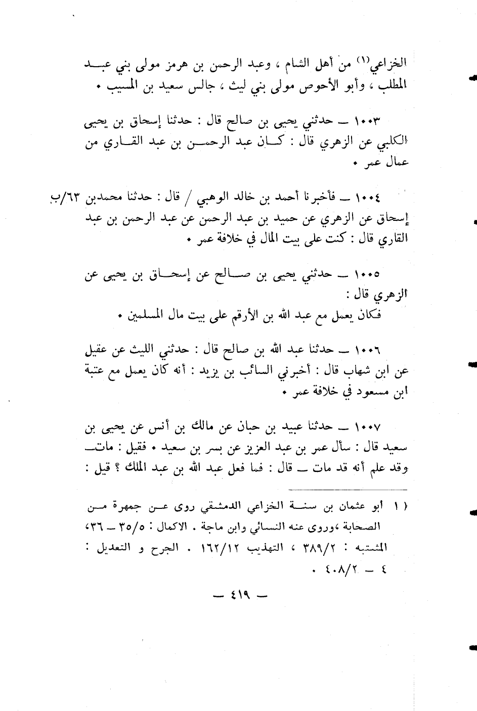 حدثنا عَبْدُ اللَّهِ بْنُ صَالِحٍ قَالَ: حَدَّثَنِي اللَّيْثُ عَنْ عُقَيْلٍ عَنِ ابْنِ شِهَابٍ قال: أَخْبَرَنِي السَّائِبُ بْنُ يَزِيدَ: أَنَّهُ كَانَ يَعْمَلُ مَعَ عُتْبَةَ ابْنِ مَسْعُودٍ فِي خِلَافَةِ عُمَرَ.