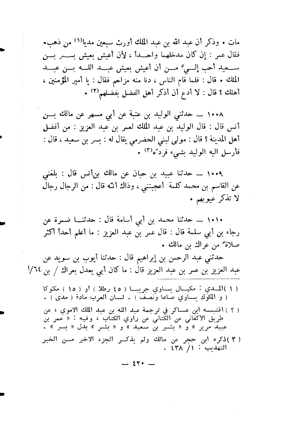 مَاتَ. وَذُكِرَ أَنَّ عَبْدَ اللَّهِ بْنَ عَبْدِ الْمَلِكِ أَوْرَثَ سَبْعِينَ مُدْيًا مِنْ ذَهَبٍ. فَقَالَ عُمَرُ: إِنْ كَانَ مَدْخَلُهُمَا وَاحِدًا، لِأَنْ أَعِيشَ بِعَيْشِ بُسْرِ بْنِ سَعِيدٍ أَحَبُّ إِلَيَّ مِنْ أَنْ أَعِيشَ بعيش عَبْدَ اللَّهِ بْنَ عَبْدِ الْمَلِكِ. قَالَ: فَلَمَّا قَامَ النَّاسُ، دَنَا مِنْهُ مُزَاحِمٌ فَقَالَ: يَا أَمِيرَ الْمُؤْمِنِينَ، أَهْلُكَ؟ قَالَ: لَا أَدَعُ أَنْ أَذْكُرَ أَهْلَ الْفَضْلِ بِفَضْلِهِمْ.