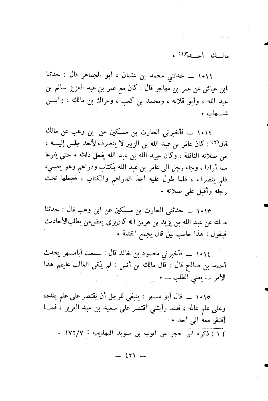فَأَخْبَرَنِي مَحْمُودُ بْنُ خَالِدٍ قال: سَمِعْتُ أَبَا مُسْهِرٍ يُحَدِّثُ أَحْمَدَ بْنَ صَالِحٍ قال: قَالَ مَالِكُ بْنُ أَنَسٍ: لَمْ يَكُنِ الْغَالِبَ عَلَيْهِمْ هَذَا الْأَمْرُ - يَعْنِي الطَّلَبَ -.