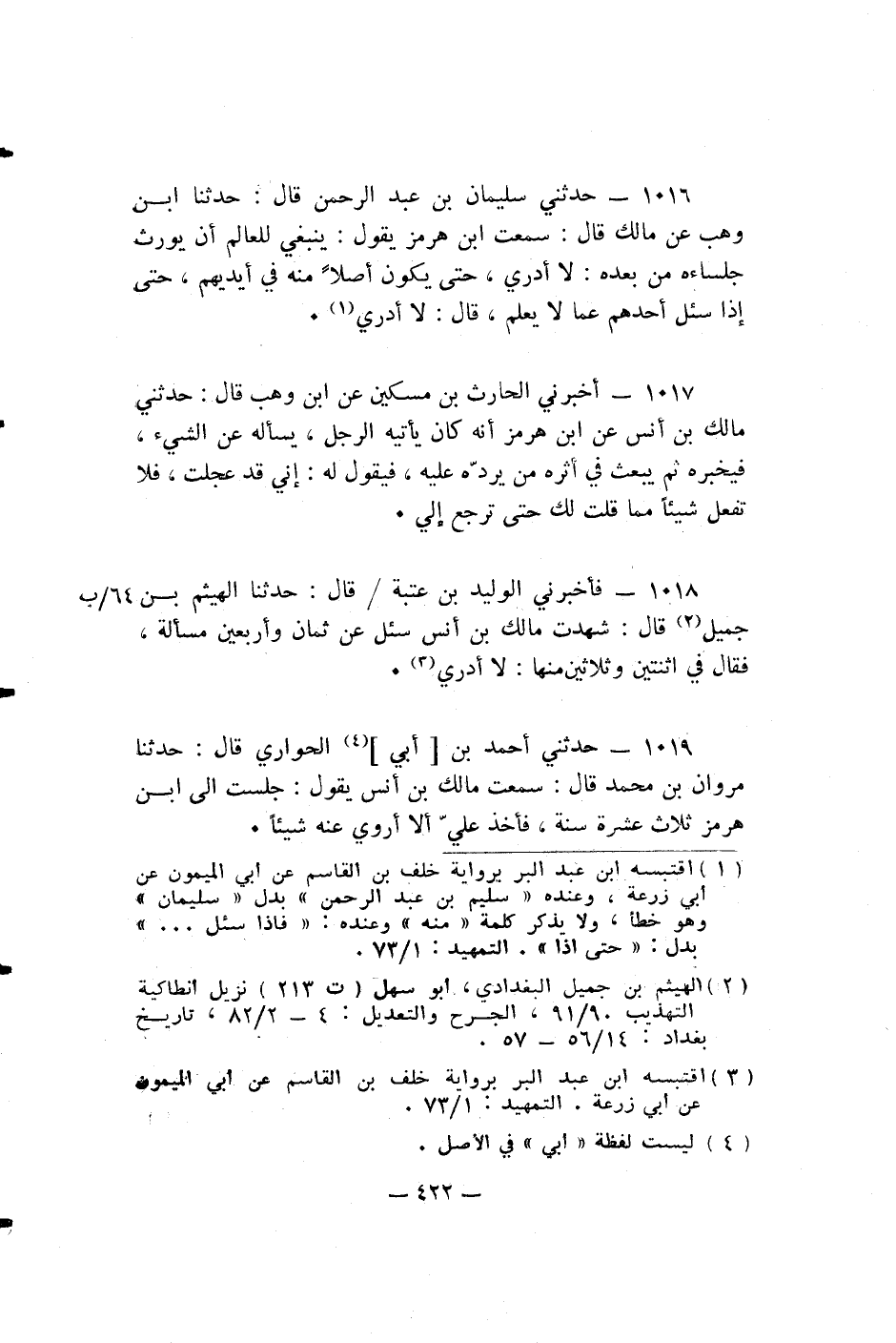 فَأَخْبَرَنِي الْوَلِيدُ بْنُ عُتْبَةَ قال: حدثنا الْهَيْثَمُ بْنُ جَمِيلٍ قَالَ: شَهِدْتُ مَالِكَ بْنَ أَنَسٍ سُئِلَ عَنْ ثَمَانٍ وَأَرْبَعِينَ مَسْأَلَةً، فَقَالَ فِي اثْنَتَيْنِ وَثَلَاثِينَ مِنْهَا: لَا أَدْرِي.