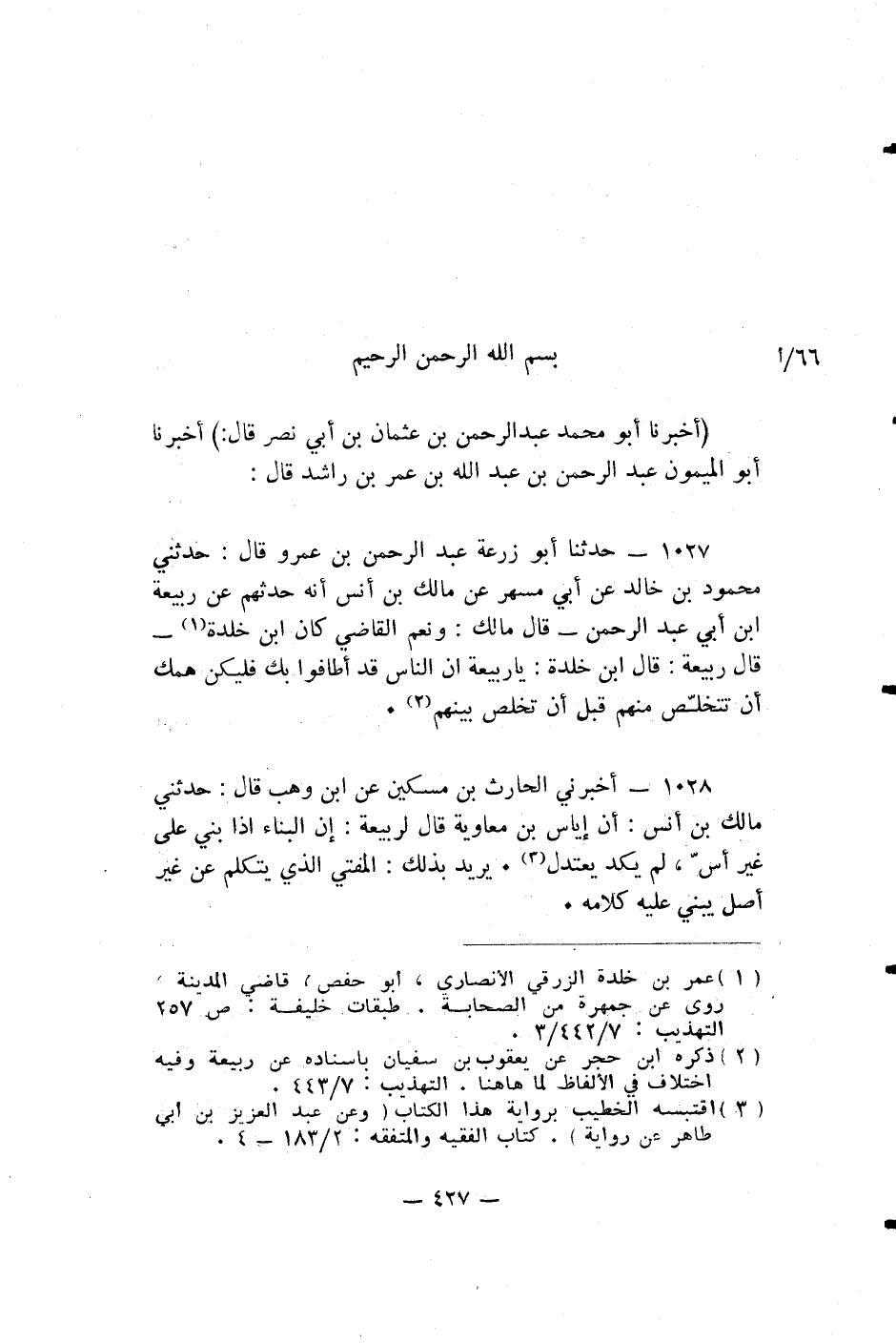 أخبرنا أبو محمد عَبْدُ الرَّحْمَنِ بْنُ عُثْمَانَ بْنِ أبي نصر قال: أخبرنا أبو الميمون عَبْدِ الرَّحْمَنِ بْنِ عَبْدِ اللَّهِ بن عمر بن راشد قال: حدثنا أَبُو زُرْعَةَ عَبْدُ الرَّحْمَنِ بْنُ عمرو قَالَ: حَدَّثَنِي مَحْمُودُ بْنُ خَالِدٍ عَنْ أَبِي مُسْهِرٍ عَنْ مَالِكِ بْنِ أَنَسٍ أَنَّهُ حَدَّثَهُمْ عَنْ رَبِيعَةَ بْنِ أَبِي عَبْدِ الرَّحْمَنِ - قَالَ مَالِكٌ: وَنِعْمَ الْقَاضِي كَانَ ابْنُ خَلْدَةَ - قَالَ رَبِيعَةُ: قَالَ ابْنُ خَلْدَةَ: يَا رَبِيعَةُ إِنَّ النَّاسِ قَدْ أَطَافُوا بِكَ فَلْيَكُنْ هَمُّكَ أَنْ تَتَخَلَّصَ مِنْهُمْ قَبْلَ أَنْ تُخَلِّصَ بَيْنَهُمْ.