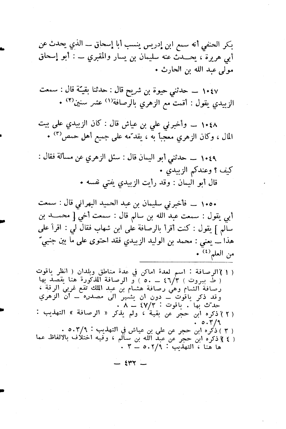 حَدَّثَنِي حَيْوَةُ بْنُ شُرَيْحٍ قال: حَدَّثَنَا بَقِيَّةُ قال: سَمِعْتُ الزُبَيْدِيَّ يَقُولُ: أَقَمْتُ مَعَ الزُّهْرِيِّ بِالرَّصَافَةِ عَشْرَ سِنِينَ.