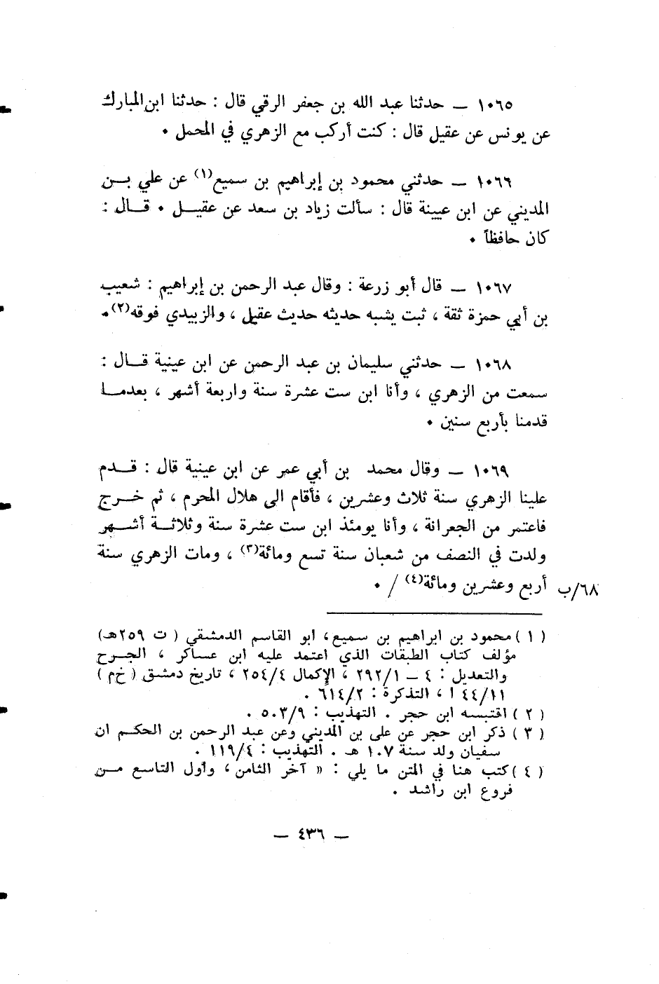 حدثنا عَبْدُ اللَّهِ بْنُ جَعْفَرَ الرَّقِّيُّ قال: حَدَّثَنَا ابْنُ الْمُبَارَكِ عَنْ يُونُسَ عَنْ عُقيْلٍ قَالَ: كُنْتُ أَرْكَبُ مَعَ الزُّهْرِيِّ فِي الْمَحْمَلِ.