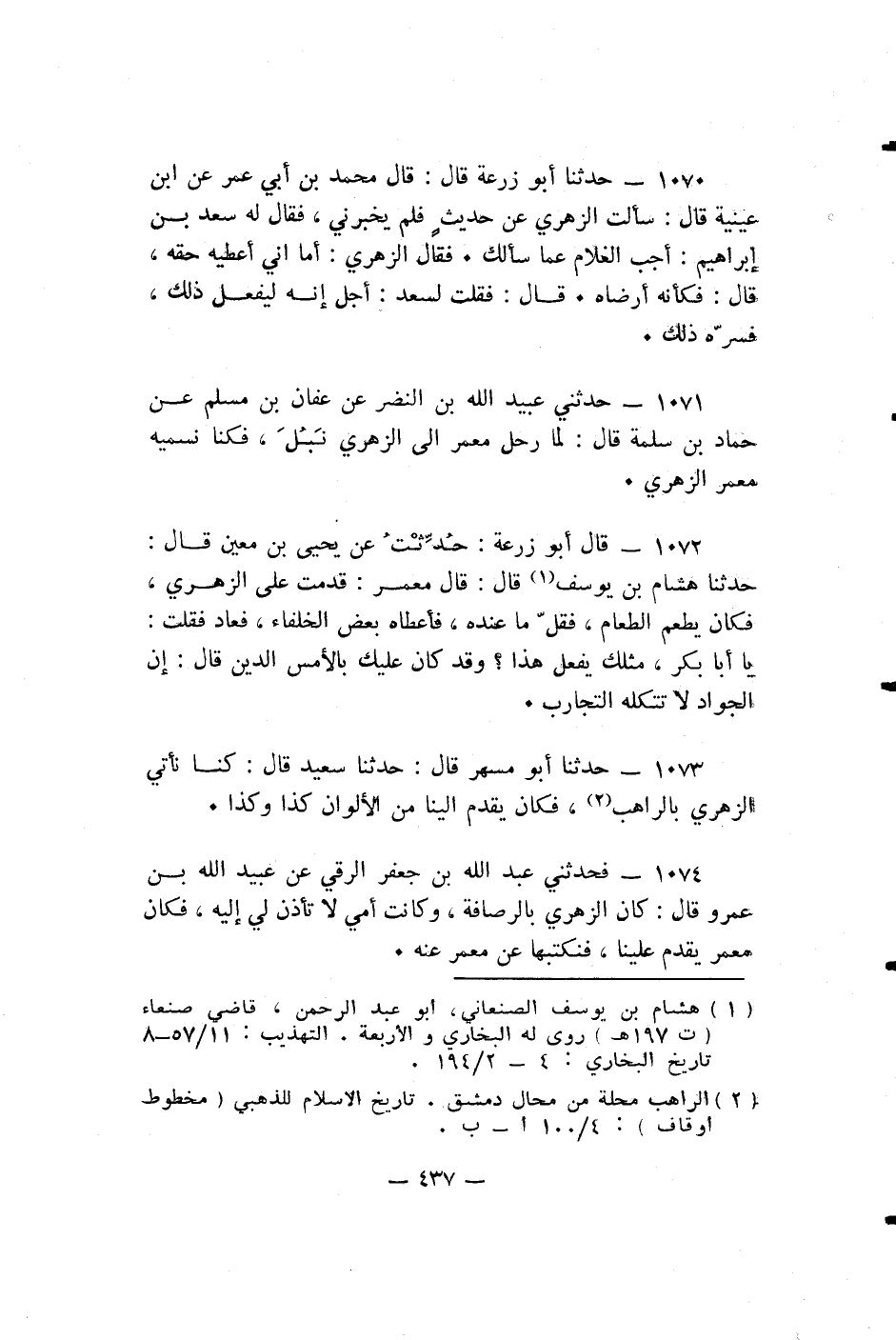حَدَّثَنَا أَبُو مُسْهِرٍ قَالَ: حدثنا سَعِيدُ قَالَ: كُنَّا نَأْتِي الزُّهْرِيَّ بِالرَّاهِبِ، فَكَانَ يُقَدِّمُ إِلَيْنَا مِنَ الْأَلْوَانِ كَذَا وَكَذَا.