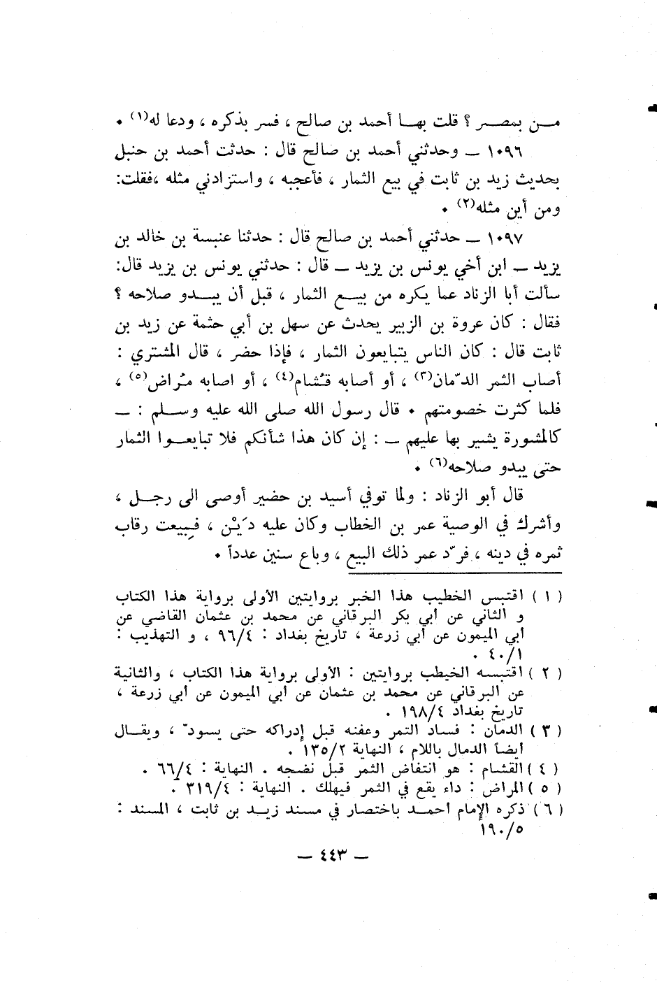 وَحَدَّثَنِي أَحْمَدُ بْنُ صَالِحٍ قَالَ: حَدَّثْتُ أَحْمَدَ بْنَ حَنْبَلٍ بِحَدِيثِ زَيْدِ بْنِ ثَابِتٍ فِي بَيْعِ الثِّمَارِ، فَأَعْجَبَهُ، وَاسْتَزَادَنِي مِثْلَهُ، فَقُلْتُ: وَمِنْ أَيْنَ مِثْلُهُ؟.