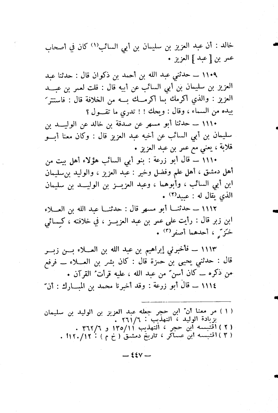 حَدَّثَنِي عَبْدُ اللَّهِ بْنُ أَحْمَدَ بْنِ ذَكْوَانَ قال: حَدَّثَنَا عَبْدَ الْعَزِيزِ بْنِ سُلَيْمَانَ بْنِ أَبِي السَّائِبِ عَنْ أَبِيهِ قَالَ: قُلْتُ لِعُمَرَ بْنِ عَبْدِ الْعَزِيزِ: وَالَّذِي أَكْرَمَكَ بِمَا أَكْرَمَكَ بِهِ مِنَ الْخِلَافَةِ قَالَ: فَاسْتَتَرَ بِيَدِهِ مِنَ السَّمَاءِ، وَقَالَ: وَيْحَكَ!! تَدْرِي مَا تَقُولُ؟ حدثنا أَبُو مُسْهِرٍ عَنْ صَدَقَةَ بْنِ خَالِدٍ عَنِ الْوَلِيدِ بْنِ سُلَيْمَانَ بْنِ أَبِي السَّائِبِ عَنْ أَخِيهِ عَبْدِ الْعَزِيزِ قَالَ: وَكَانَ مَعَنَا أَبُو قِلَابَةَ، يَعْنِي مَعَ عُمَرَ بْنِ عَبْدِ العزيز.