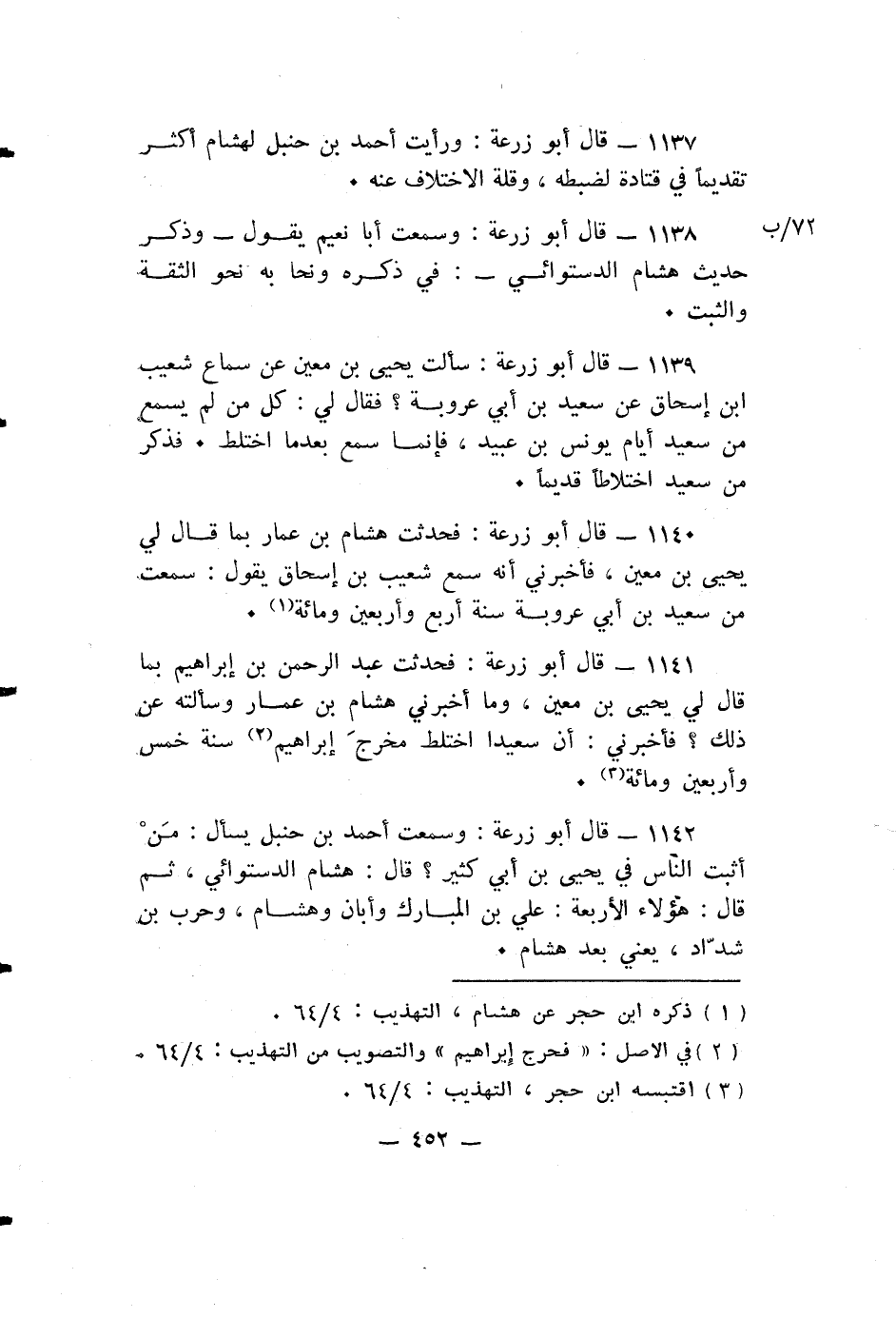 قال أبو زرعة: فَحَدَّثْتُ هِشَامَ بْنَ عَمَّارٍ بِمَا قَالَ لِي يَحْيَى بْنُ مَعِينٍ، فَأَخْبَرَنِي أَنَّهُ سَمِعَ شُعَيْبَ بْنَ إِسْحَاقَ يَقُولُ: سَمِعْتُ مِنْ سَعِيدِ بْنِ أَبِي عَرُوبَةَ سَنَةَ أَرْبَعٍ وأربعين ومائة.
