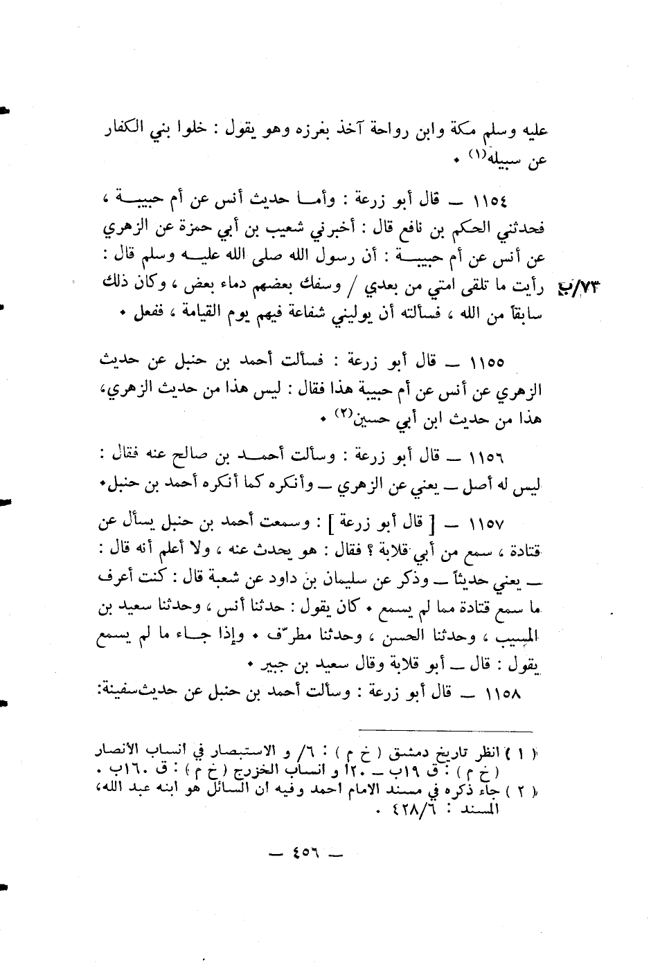 قَالَ أبو زرعة: فَسَأَلْتُ أَحْمَدَ بْنَ حَنْبَلٍ عَنْ حَدِيثِ الزُّهْرِيِّ عَنْ أَنَسٍ عَنْ أُمِّ حَبِيبَةَ هَذَا فَقَالَ: لَيْسَ هَذَا مِنْ حَدِيثِ الزُّهْرِيِّ، هَذَا مِنْ حَدِيثِ ابْنِ أَبِي حُسَيْنِ.
