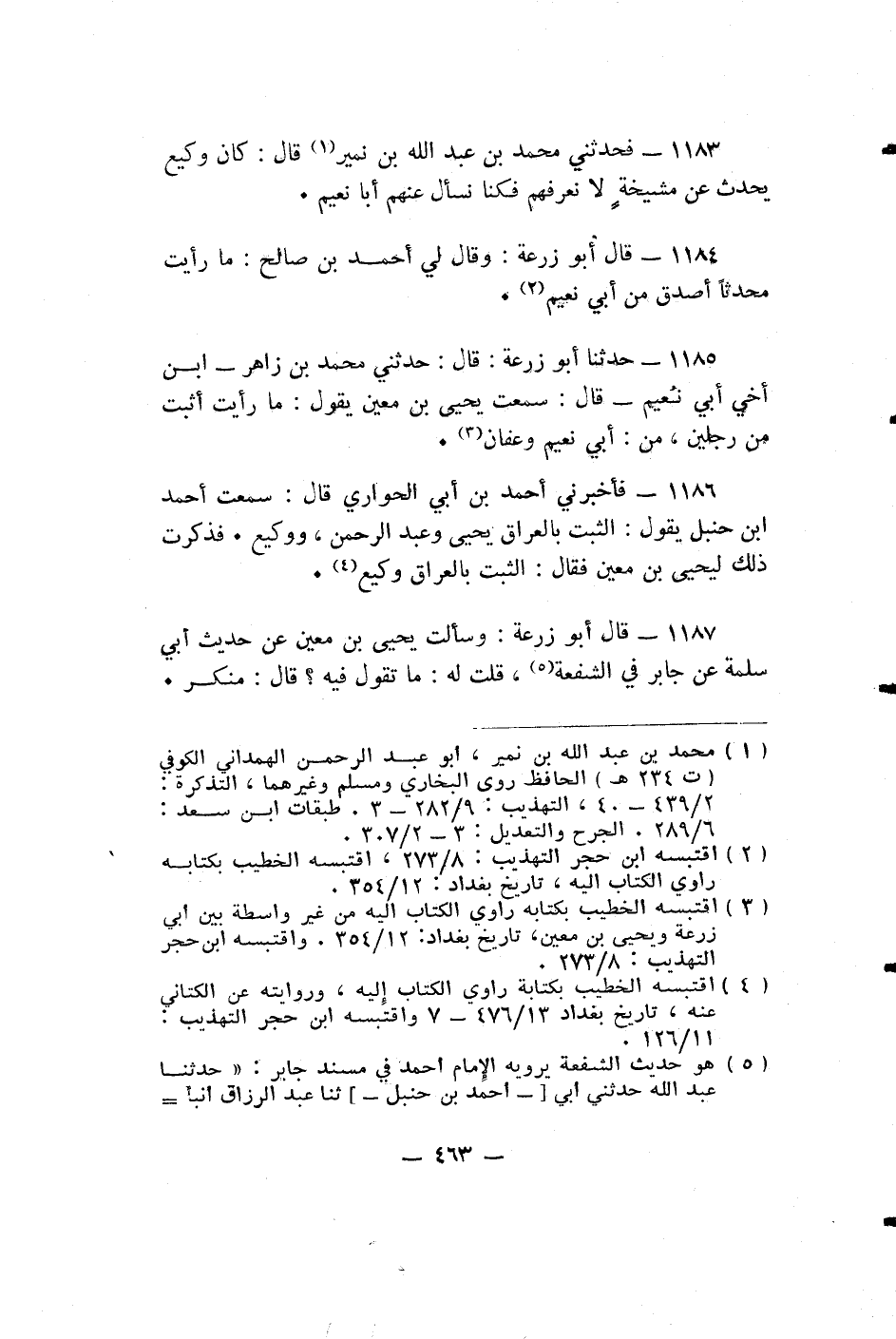 فَحَدَّثَنِي مُحَمَّدُ بْنُ عَبْدِ اللَّهِ بْنِ نُمَيْرٍ قَالَ: كَانَ وَكِيعٌ يُحَدِّثُ عَنْ مَشَيَخَةٍ لَا نَعْرِفُهُمْ فَكُنَّا نَسْأَلُ عَنْهُمْ أَبَا نُعَيْمٍ.