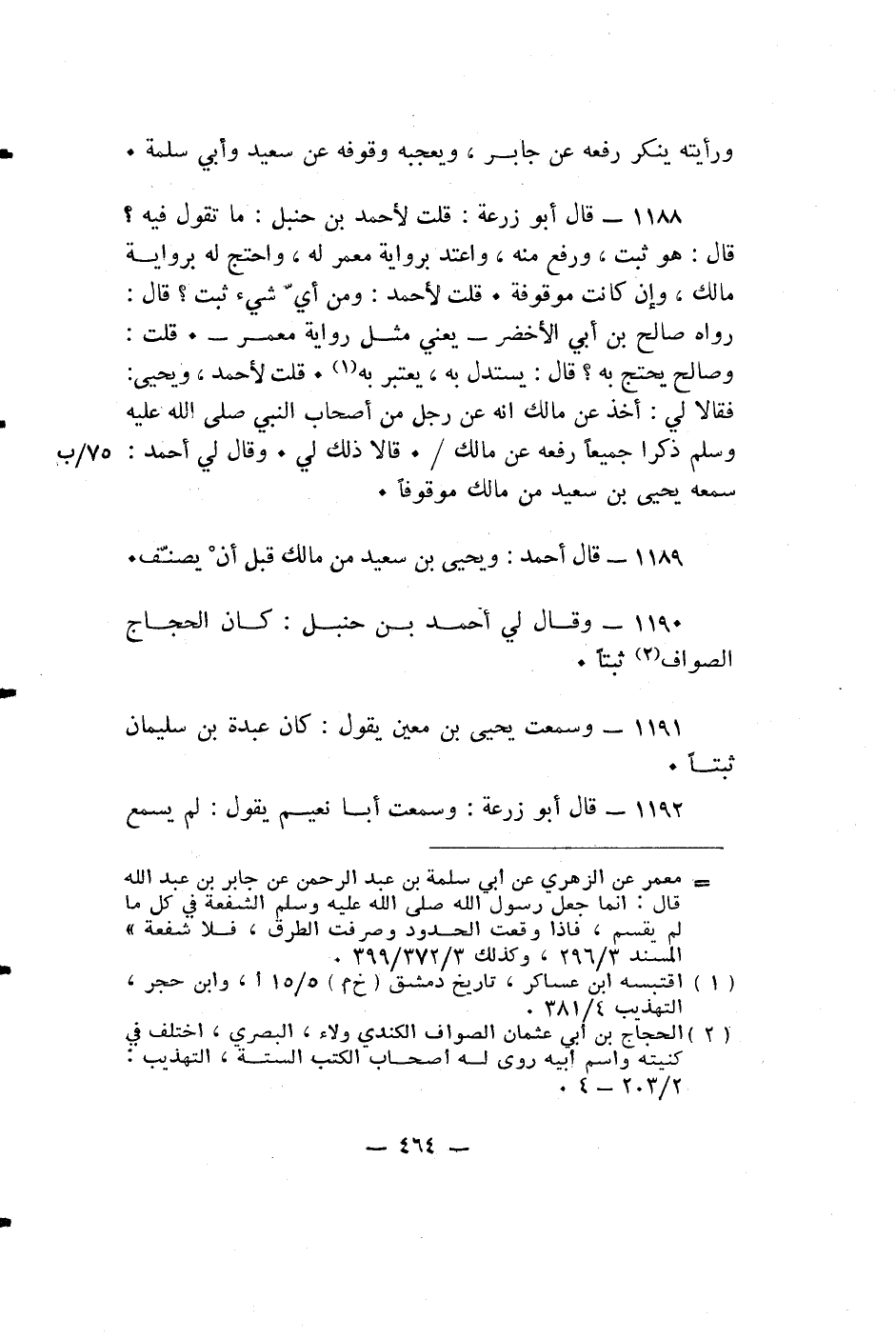 قال أبو زرعة: قُلْتُ لِأَحْمَدَ بْنِ حَنْبَلٍ: مَا تَقُولُ فِيهِ؟ قَالَ: هُوَ ثَبْتٌ، وَرَفَعَ مِنْهُ، وَاعْتَدَّ بِرِوَايَةِ مَعْمَرٍ لَهُ، وَاحْتَجَّ لَهُ بِرِوَايَةِ مَالِكٍ، وَإِنْ كَانَتْ مَوْقُوفَةً. قُلْتُ لِأَحْمَدَ: وَمِنْ أَيِّ شَيْءٍ ثَبُتَ؟ قَالَ: رَوَاهُ صَالِحُ بْنُ أَبِي الْأَخْضَرِ - يَعْنِي مِثْلَ رِوَايَةِ مَعْمَرٍ -. قُلْتُ: وَصَالِحٌ يُحْتَجُّ بِهِ؟ قَالَ: يُسْتَدَلُّ بِهِ، يُعْتَبَرُ بِهِ. قُلْتُ لِأَحْمَدَ، وَيَحْيَى: فقالا لِي: أَخَذَ عَنْ مَالِكٍ أَنَّهُ عَنْ رَجُلٍ مِنْ أَصْحَابِ النَّبِيِّ صَلَّى اللَّهُ عَلَيْهِ وسَلَّمَ ذِكْرًا جَمِيعًا رَفَعَهُ عَنْ مَالِكٍ. قَالَا ذَلِكَ لِي. وَقَالَ لِي أَحْمَدُ: سَمِعَهُ يَحْيَى بْنُ سَعِيدٍ مُنْ مَالِكٍ مَوْقُوفًا.
