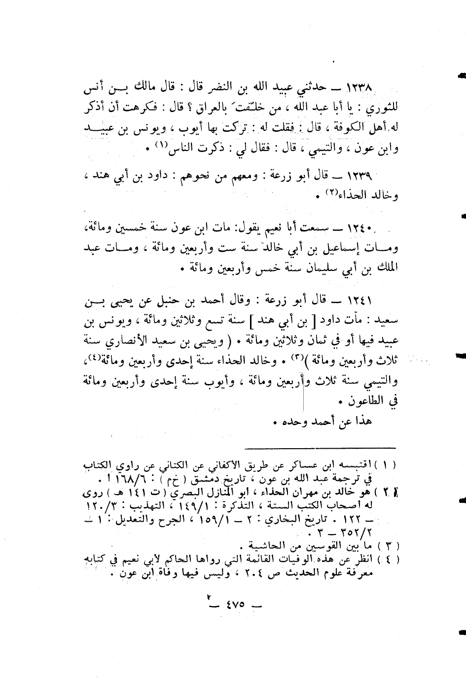 قال أبو زرعة: وَقَالَ أَحْمَدُ بْنُ حَنْبَلٍ عَنْ يَحْيَى بْنِ سَعِيدٍ: مَاتَ دَاوُدُ بْنُ أَبِي هِنْدٍ سَنَةَ تِسْعٍ وَثَلَاثِينَ وَمِائَةٍ، وَيُونُسُ بْنُ عُبَيْدٍ فِيهَا أَوْ فِي ثَمَانٍ وَثَلَاثِينَ وَمِائَةٍ. وَيَحْيَى بْنُ سَعِيدٍ الْأَنْصَارِيُّ سَنَةَ ثَلَاثٍ وَأَرْبَعِينَ وَمِائَةٍ. وَخَالِدٌ الْحَذَّاءُ سَنَةَ إِحْدَى وَأَرْبَعِينَ وَمِائَةٍ، وَالتَّيْمِيُّ سَنَةَ ثَلَاثٍ وَأَرْبَعِينَ وَمِائَةٍ، وَأَيُّوبُ سَنَةَ إِحْدَى وَأَرْبَعِينَ وَمِائَةٍ فِي الطَّاعُونِ.