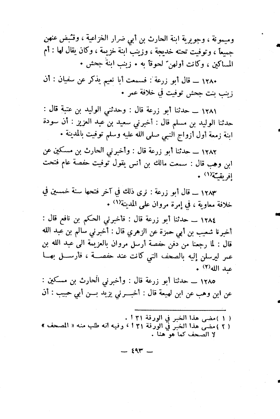 حدثنا أبو زرعة قَالَ: فَأَخْبَرَنِي الْحَكَمُ بْنُ نَافِعٍ قَالَ: أَخْبَرَنَا شُعَيْبُ بْنُ أَبِي حَمْزَةَ عَنِ الزُّهْرِيِّ قال: أَخْبَرَنِي سالم بن عبد اله قَالَ: لَمَّا رَجَعْنَا مِنْ دَفْنِ حَفْصَةَ أَرْسَلَ مَرْوَانُ بِالْعُزَيْمَةِ إِلَى عَبْدِ اللَّهِ بْنِ عُمَرَ لِيُرْسِلَنَّ إِلَيْهِ بِالصُّحُفِ الَّتِي كَانَتْ عِنْدَ حَفْصَةَ، فَأَرْسَلَ بِهَا عَبْدُ اللَّهِ.