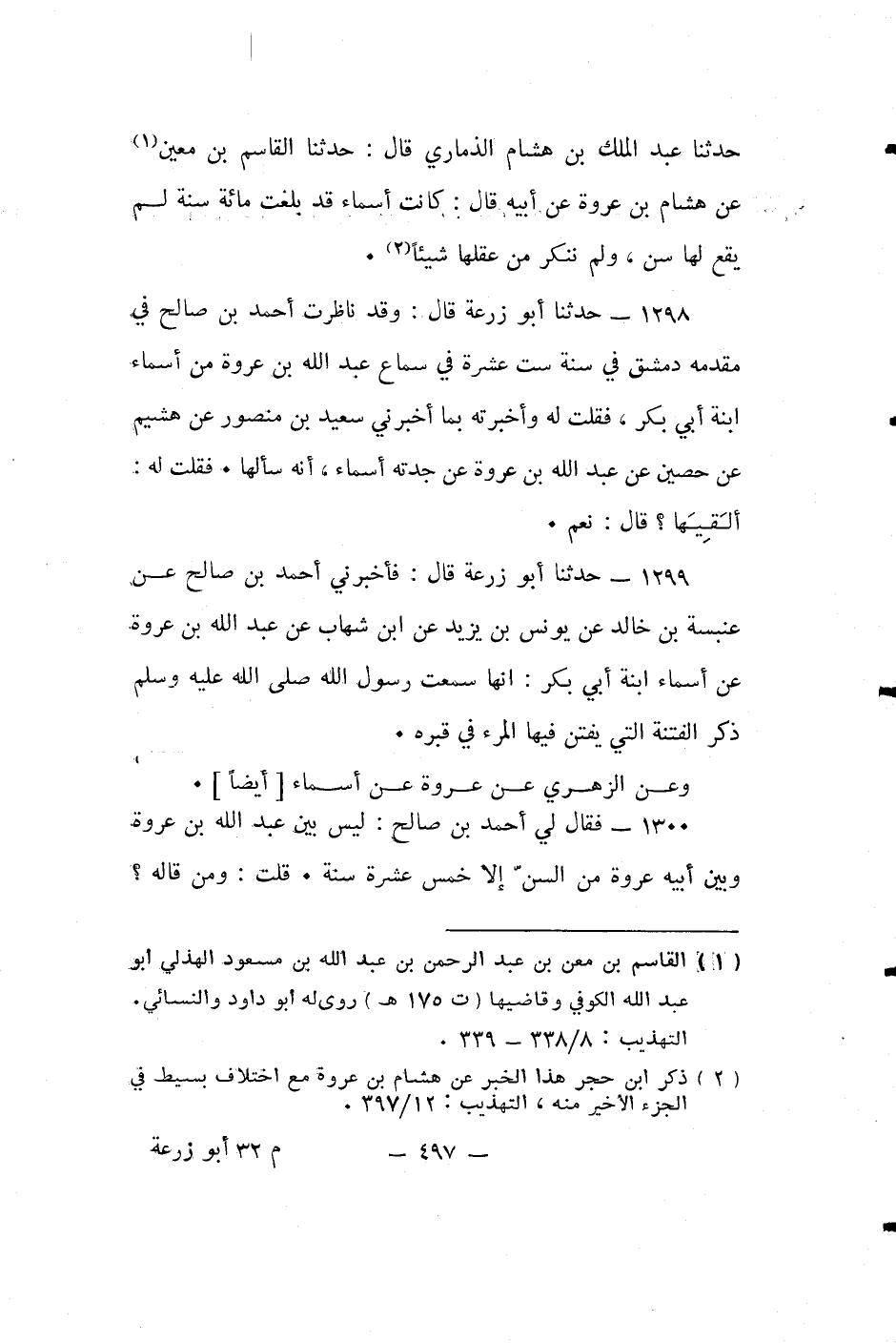 حدثنا أبو زرعة قَالَ: وَقَدْ نَاظَرْتُ أَحْمَدَ بْنَ صَالِحٍ فِي مَقْدِمِهِ دِمَشْقَ فِي سَنَةِ سِتَّ عَشْرَةَ فِي سَمَاعِ عَبْدِ اللَّهِ بْنِ عُرْوَةَ مِنْ أَسْمَاءَ ابْنَةِ أَبِي بَكْرٍ، فَقُلْتُ لَهُ وَأَخْبَرْتُهُ بِمَا أَخْبَرَنِي سَعِيدُ بْنُ مَنْصُورٍ عَنْ هُشَيمٍ عَنْ حُصَيْنٌ عَنْ عَبْدِ اللَّهِ بْنِ عُرْوَةَ عَنْ جَدَّتِهِ أَسْمَاءَ، أَنَّهُ سَأَلَهَا. فَقُلْتُ لَهُ: أَلَقِيَهَا؟ قَالَ: نعم.