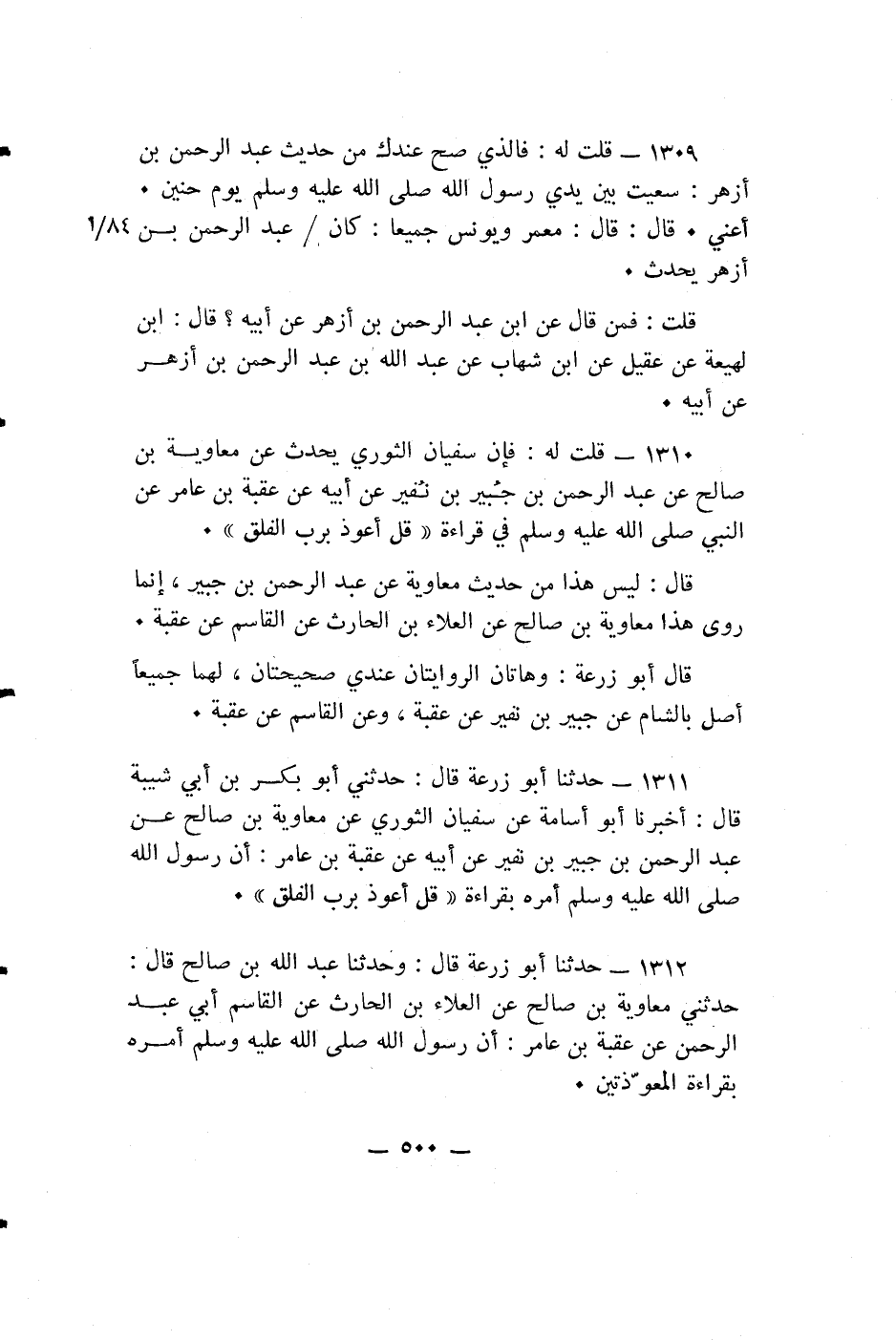 حدثنا أبو زرعة قَالَ: حَدَّثَنِي أَبُو بَكْرِ بْنُ أَبِي شَيْبَةَ قَالَ: أَخْبَرَنَا أَبُو أُسَامَةَ عَنْ سُفْيَانَ الثَّوْرِيِّ عَنْ مُعَاوِيَةَ بْنِ صَالِحٍ عَنْ عَبْدِ الرَّحْمَنِ بْنِ جُبَيْرِ بْنِ نُفَيْرٍ عَنْ أَبِيهِ عَنْ عُقْبَةَ بْنِ عَامِرٍ: أَنَّ رَسُولَ اللَّهِ صَلَّى اللَّهُ عَلَيْهِ وسَلَّمَ أَمَرَهُ بِقِرَاءَةِ " قُل أَعُوذُ بربِّ الْفَلَقِ ".