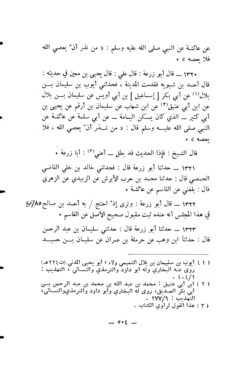 قال أبو زرعة: قَالَ عَلُيُّ: قَالَ يَحْيَى بْنُ مَعِينٍ فِي حَدِيثِهِ: قَالَ أَحْمَدُ بْنُ شَبُّوَيْهِ فَقَدِمْتُ الْمَدِينَةَ، فَحَدَّثَنِي أَيُّوبُ بْنُ سُلَيْمَانَ بْنِ بِلَالٍ عَنْ أَبِي بَكْرٍ إِسْمَاعِيلَ بْنِ أَبِي أُوَيْسٍ عَنْ سُلَيْمَانَ بْنِ بلال عن أَبِي عَتِيقٍ عَنِ ابْنِ شِهَابٍ عَنْ سُلَيْمَانَ بْنِ أَرْقَمٍ عَنِ يَحْيَى بْنِ أَبِي كَثِيرٍ - الَّذِي كَانَ يَسْكُنُ الْيَمَامَةَ - عَنْ أَبِي سَلَمَةَ عَنْ عَائِشَةَ عَنِ النَّبِيِّ صَلَّى اللَّهُ عَلَيْهِ وسَلَّمَ قَالَ: مَنْ نَذَرَ أَنْ يَعْصِيَ اللَّهَ، فَلَا يَعْصِهِ.