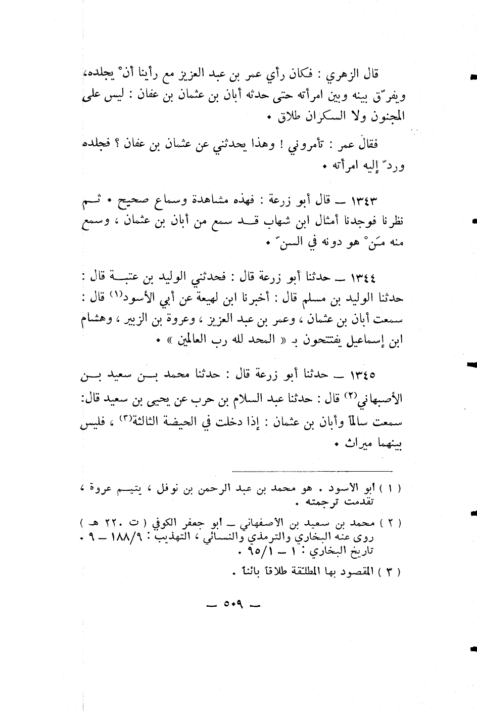 حدثنا أبو زرعة قَالَ: حدثنا مُحَمَّدُ بْنُ سَعِيدِ بْنِ الْأَصْبَهَانِيُّ قال: حَدَّثَنَا عَبْدُ السَّلَامِ بْنُ حَرْبٍ عَنْ يَحْيَى بْنِ سَعِيدٍ قَالَ: سَمِعْتُ سَالِمًا وَأَبَانَ بْنَ عُثْمَانَ: إِذَا دَخَلَتْ فِي الْحَيْضَةِ الثَّالِثَةِ، فَلَيْسَ بَيْنَهُمَا مِيرَاثٌ.