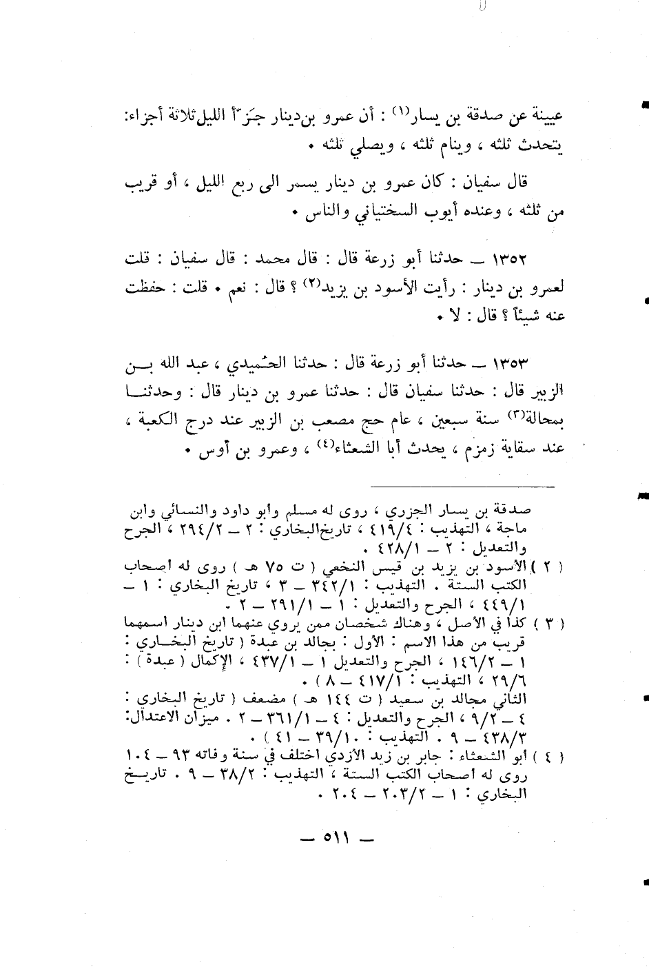 عُيَيْنَةَ عَنْ صَدَقَةَ بْنَ يَسَارٍ: أَنَّ عَمْرَو بْنَ دِينَارٍ جَزَّأَ اللَّيْلَ ثَلَاثَةَ أَجْزَاءٍ: يَتَحَدَّثُ ثُلُثَهُ، وَيَنَامُ ثُلُثَهُ، وَيُصَلِّي ثُلُثَهُ.