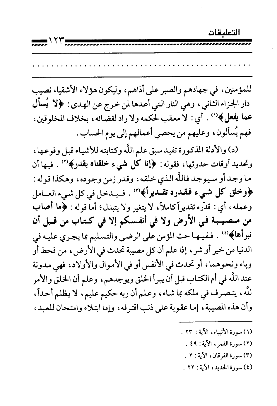 (د) والأدلة المذكورة تفيد سبق علم الله وكتابته للأشياء قبل وقوعها، وتحديد أوقات حدوثها، فقوله: {إِنَّا كُلَّ شَيْءٍ خَلَقْنَاهُ بِقَدَرٍ} فيها أن ما وجد أو سيوجد فالله الذي خلقه، وقدر زمن وجوده، وهكذا قوله: {وَخَلَقَ كُلَّ شَيْءٍ فَقَدَّرَهُ تَقْدِيرًا} فيدخل في كل شيء العامل وعمله، أي: قدره تقديرا كاملا، لا يتغير ولا يتبدل.